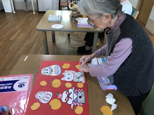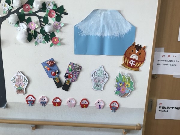 さ~て、クリスマスも終わり、みんなでコツコツとレク時間に作りましたお正月用飾り塗り絵等を模様替えします。