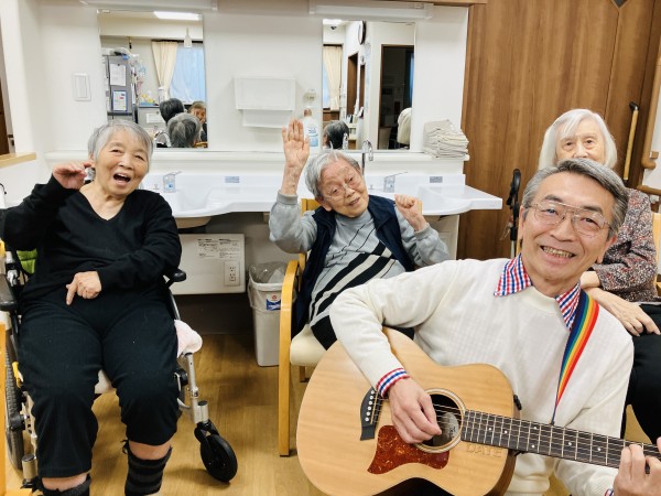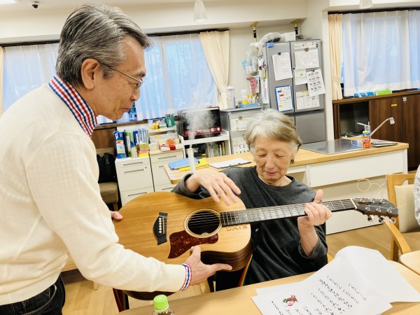 昨年の9月から来て頂いています。ギターコンサート♬ 回を重ねる度に違うギターを持ってきて下さり、皆さん興味津々!!(昨年12月のご様子です)