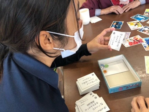 午前中のゆっくりとした時間を狙って近くにいた方を集めてカルタをした様子です♪♪