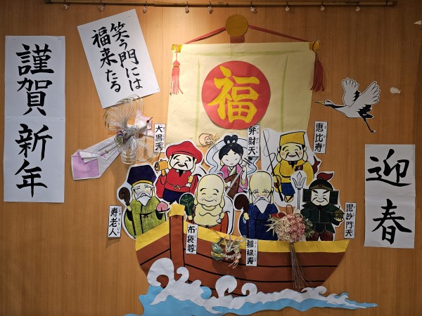 1F玄関には、今年一年の健康と幸せを願って鏡餅を飾り、壁には七福神の飾り絵を掲示しました。