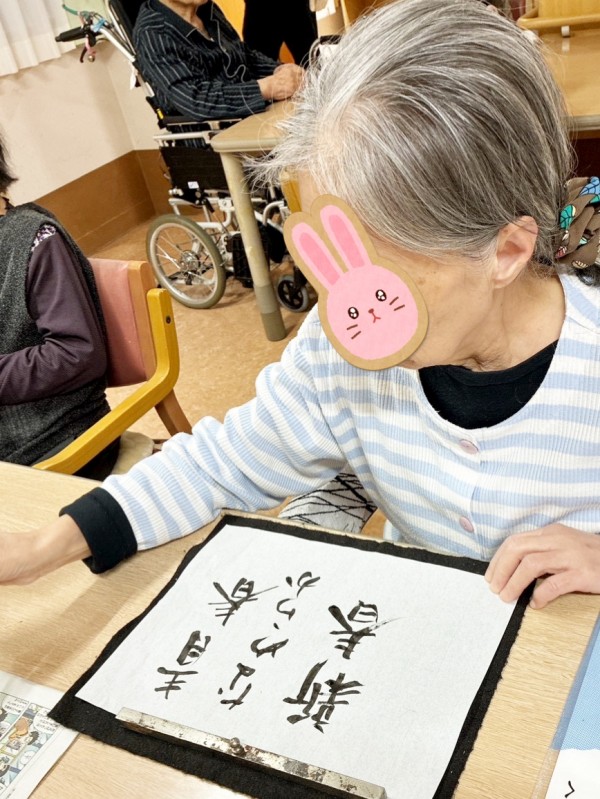 職員と一緒に一文字ずつ確認しながら書かれる方もいらっしゃいました。Y様は「そんなの出来ないよう」とおっしゃいながらも、いざ始めると「正月」のニ文字を一気に書き上げられ、力強い作品が完成しました。Ⅰ様は書道の段をお持ちで、「ここは跳ねるんだっけ?とめるんだっけ?」と少し迷われながらも、「謹賀新年」をとても達筆に書いてくださいました。