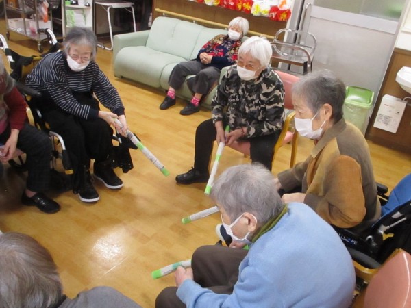 座位のまま行える棒サッカーは、腕や肩をしっかり動かしながら、集中力や反応力、チームワークも養えるレクリエーションです。とても盛り上がり、笑顔あふれる時間となりました♪