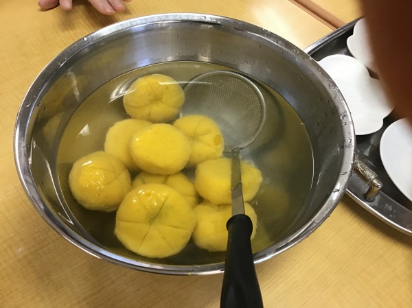 沸騰したお湯の中に、カボチャ白玉を入れていきます。