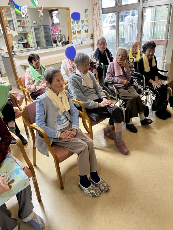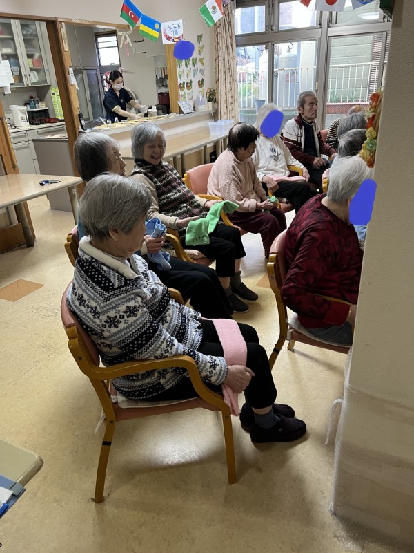 今回は1、2階合同で運動指導員による「訪問運動教室」のタオル体操を行いましたので、