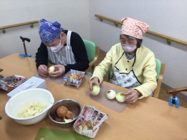 タマネギは皮を剥く所からお手伝いをお願いしまして…!!