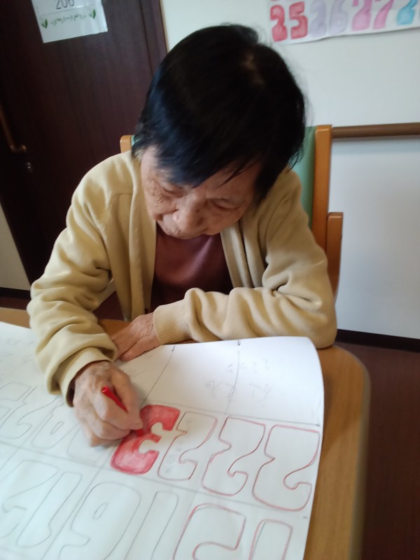 月末になると、松風が誇るNo1デザイナースタッフが下書きしたカレンダーに入居者様が色塗りしてくださいます