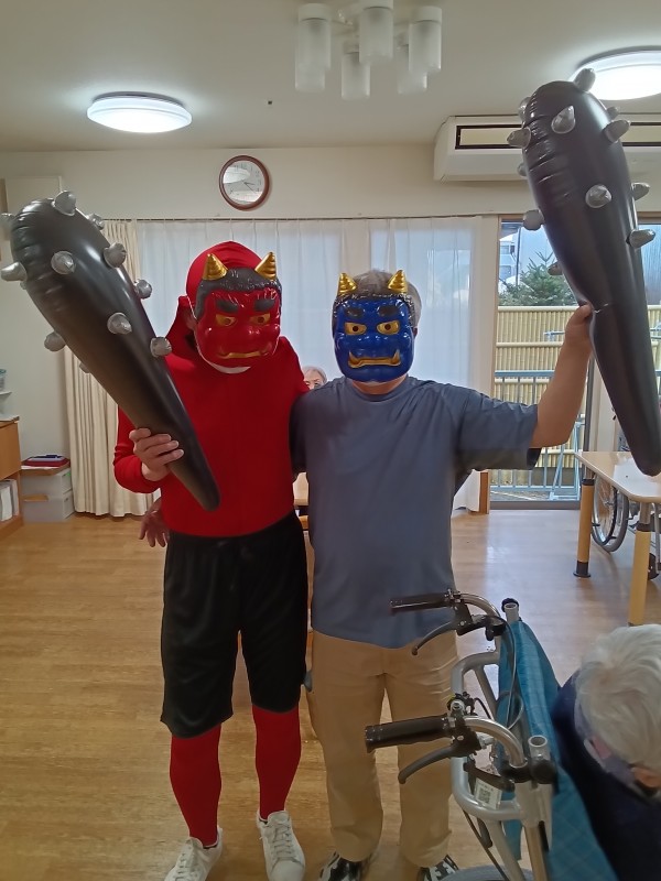 名取ホーム長による全身赤タイツ着用の赤鬼と大島職員による青鬼の登場!!