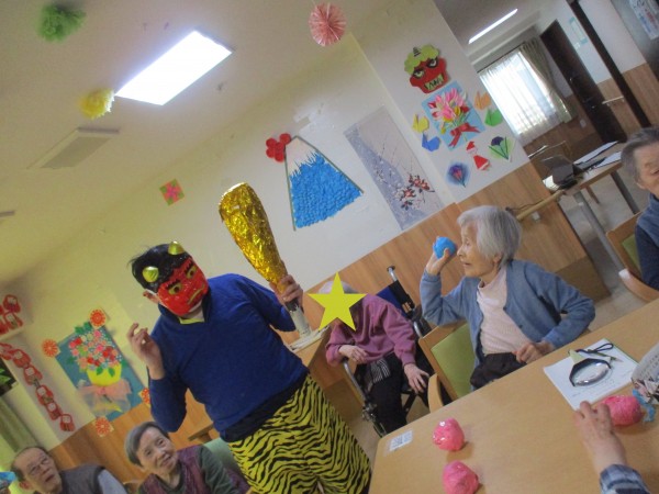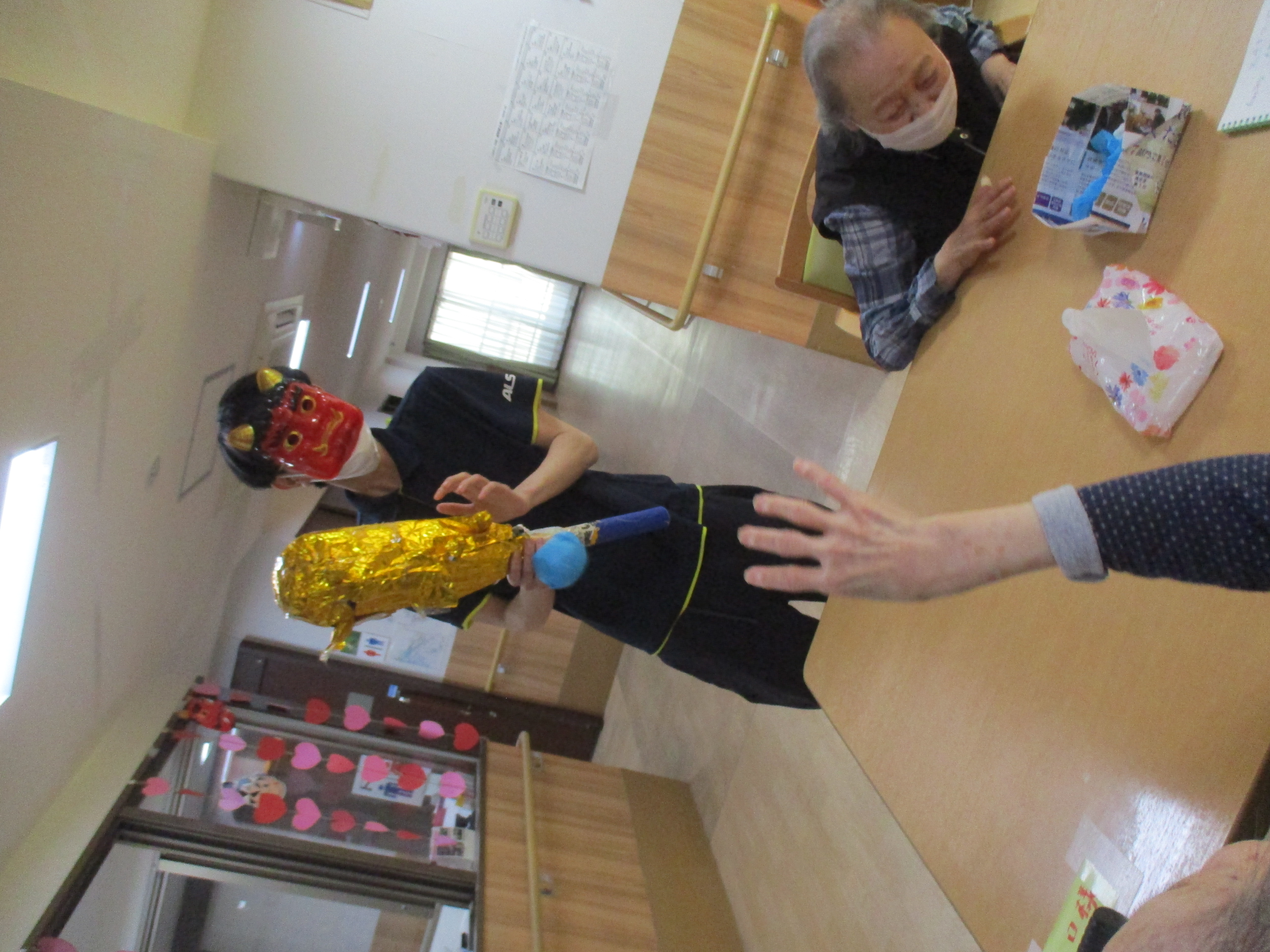 皆さん、青鬼・赤鬼に新聞で丸めた豆をぶつけて厄払い✨