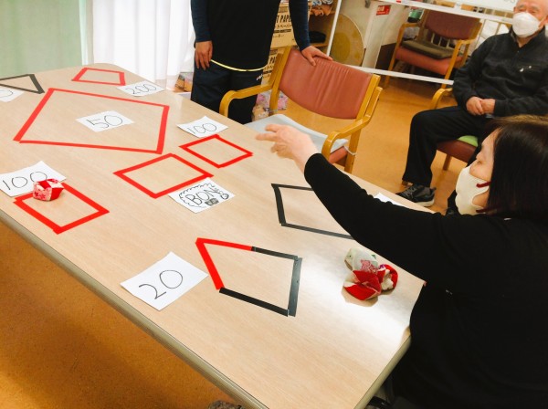 今回はテーブル上にテープを貼り、その中に入れば点数が入るルールになります