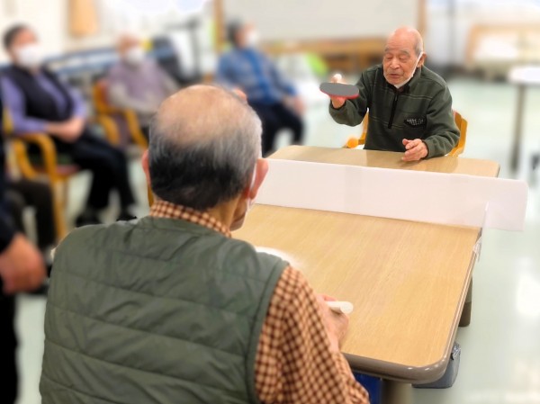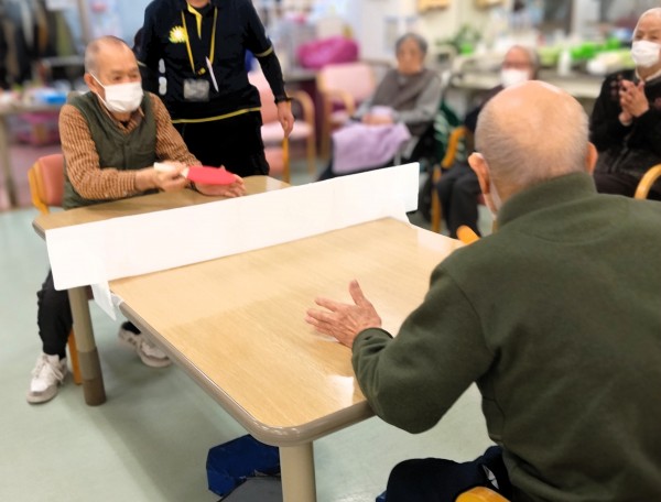 職員お手製の仕切りボードをネット代わりにテーブルに設置してピンポン玉を打ち合っていただきました♪