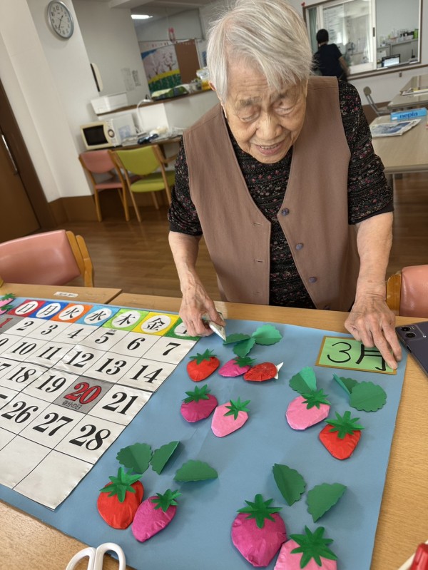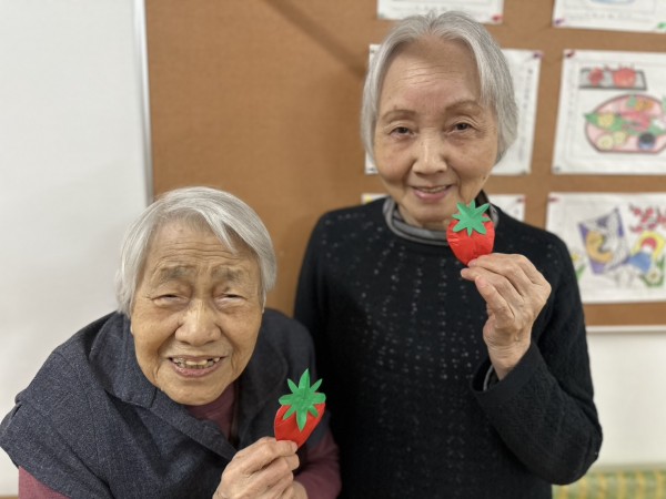 型紙を使い色画用紙から『苺や葉っぱ』を切り出したり、台紙にティッシュをのせてお花紙でくるみ、立体的にイチゴを作って頂きました☆