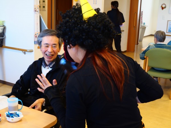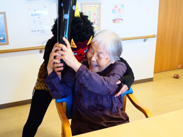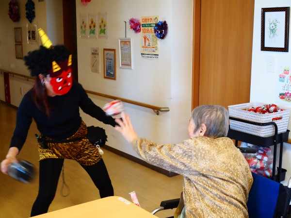 2月3日の節分は、ご利用者様に豆(紙のボール)を投げていただき