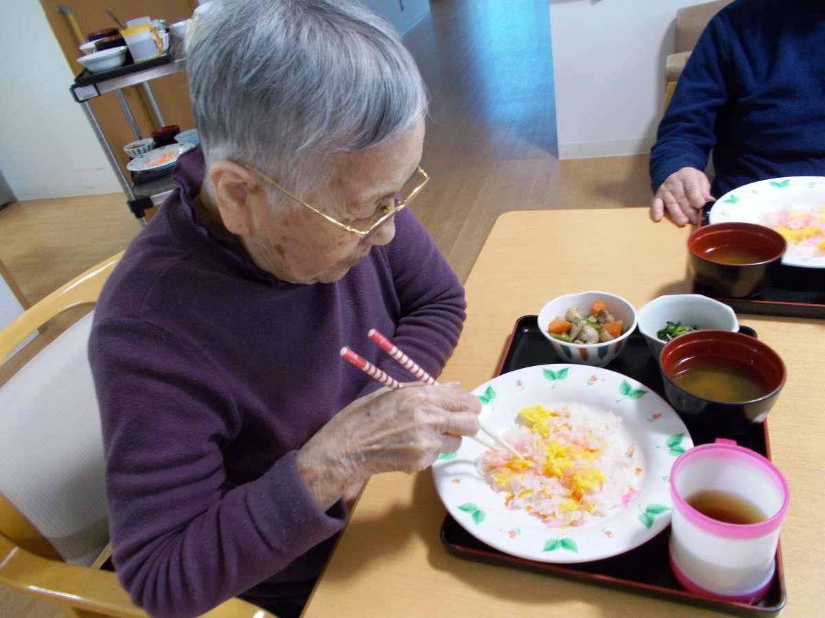 昼食はちらしずし、菜の花のお浸し、煮物、澄まし汁でおいしく頂きました!