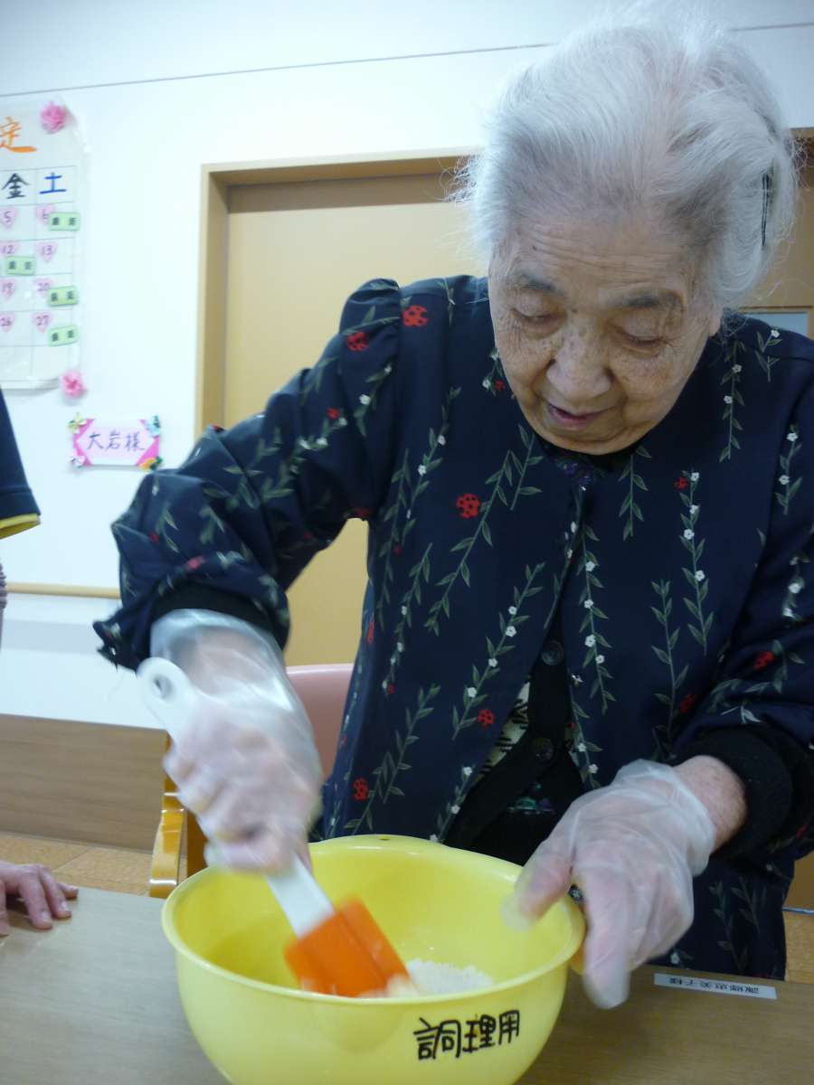 今日は、お誕生会で召し上がる、チーズケーキを、スタッフとご利用者様で、手作りしました。
