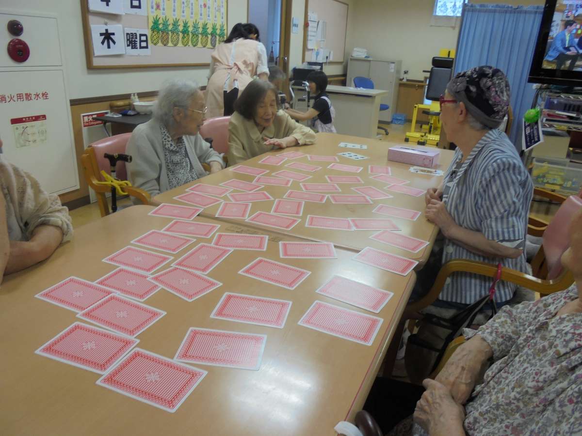 7月4日木曜日のお昼休憩の時、各テーブルに分かれ坊主めくりとトランプゲーム