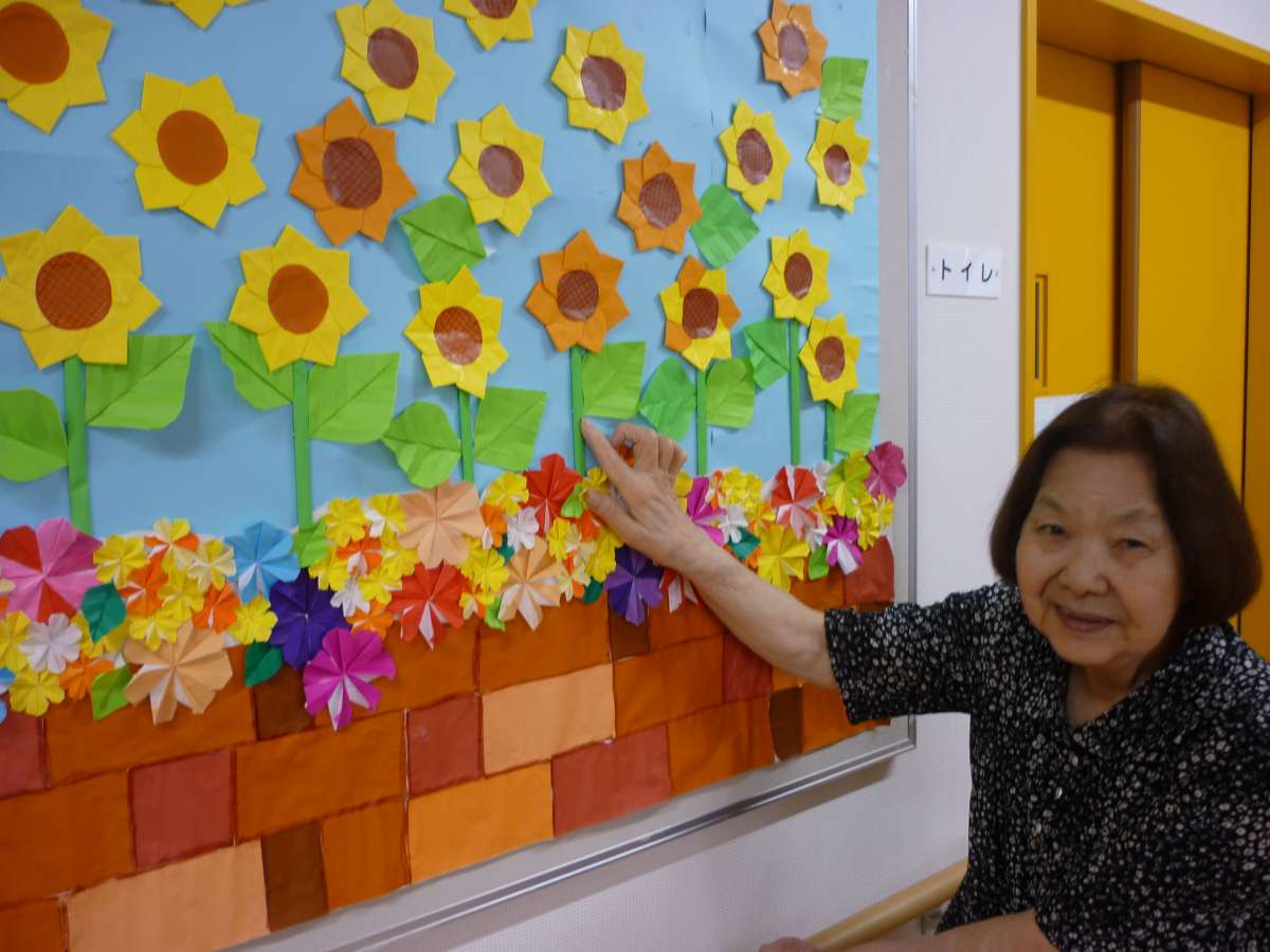 折り紙で、向日葵を作ってくださった、ご利用者様、はい!!!チーズ!!!