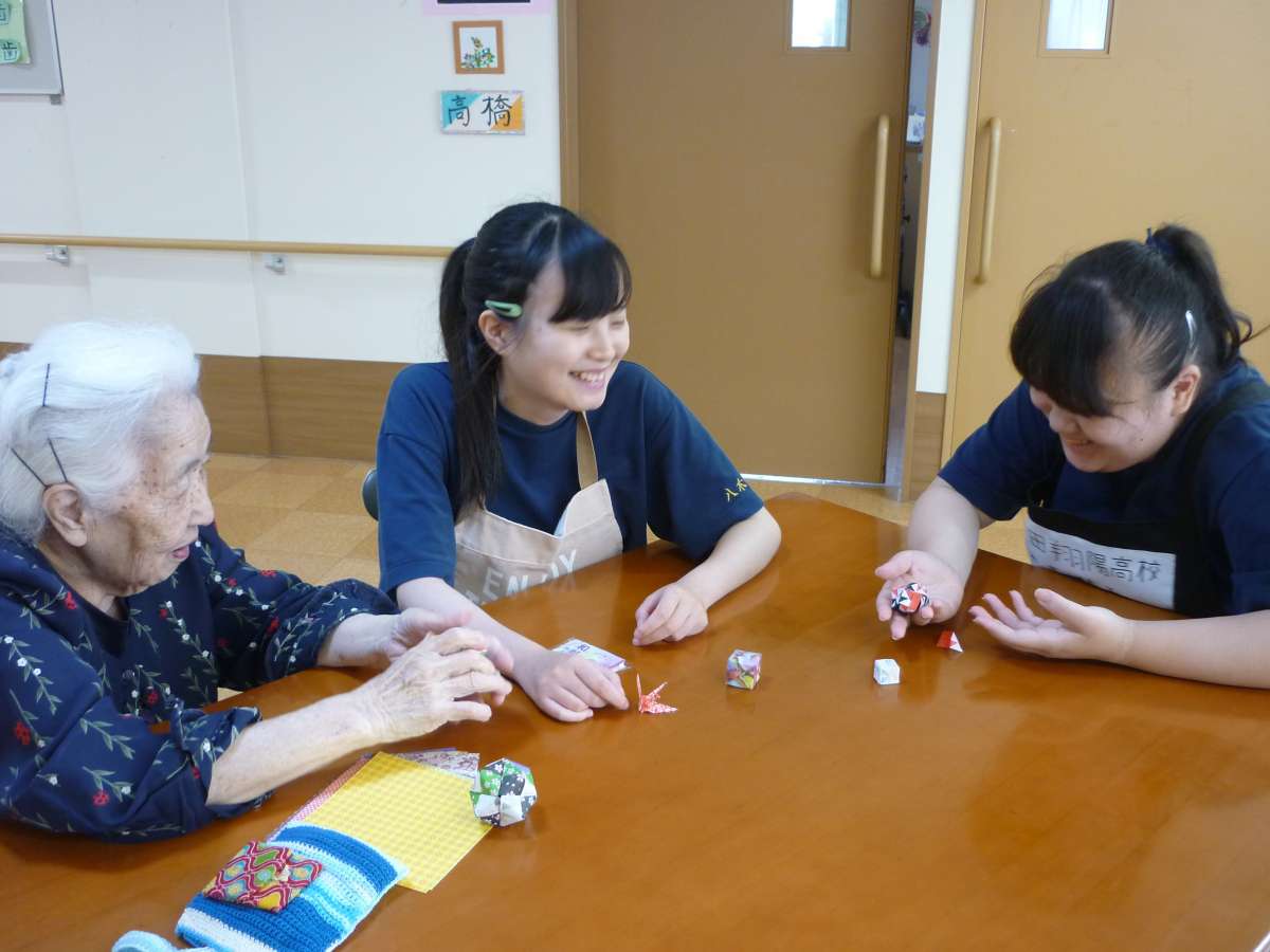 ご利用者様が、実習生さんに折り鶴、風船を教えながら、一緒に作られています。