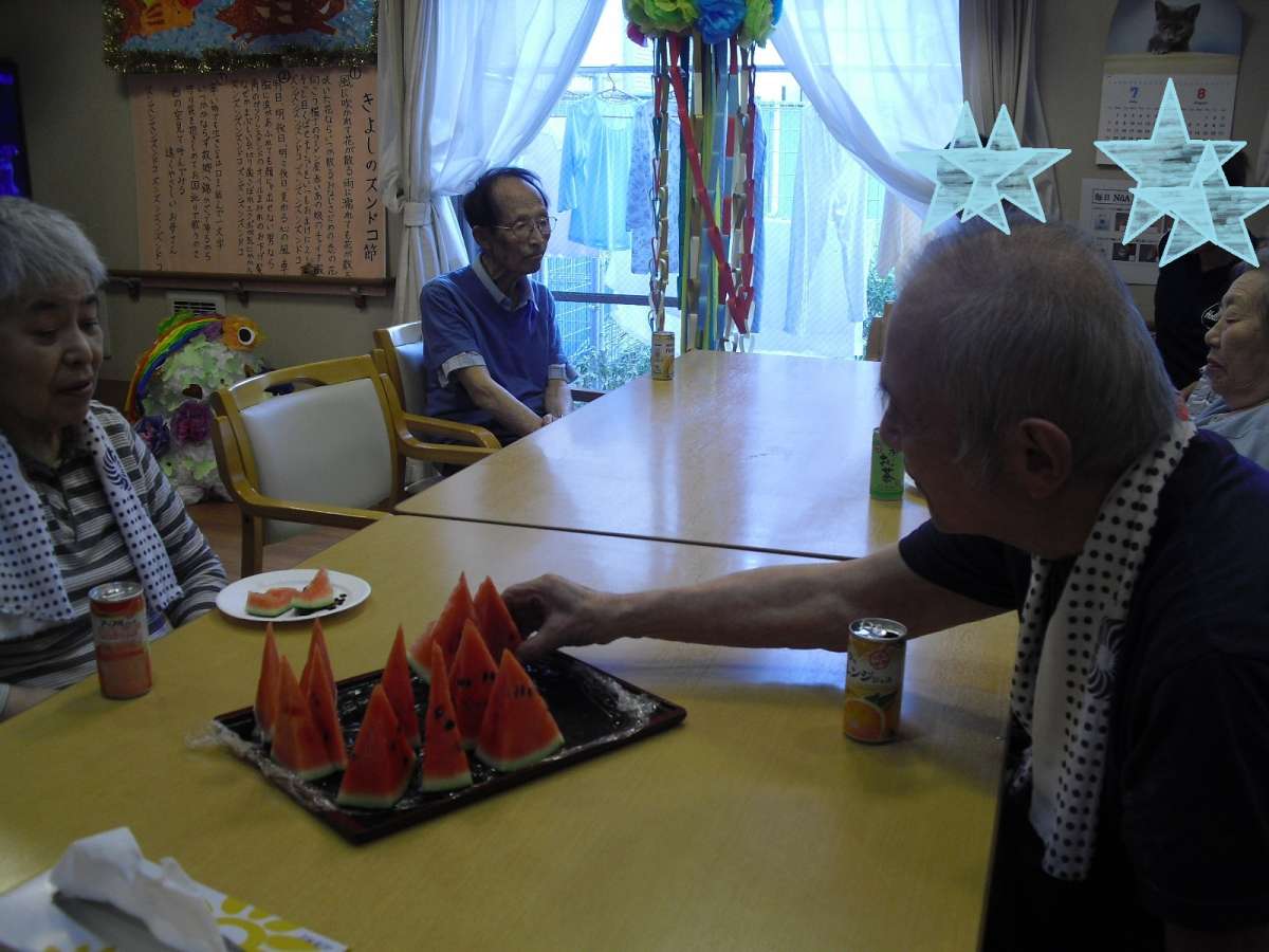 | 皆様こんにちは、 グループホーム みんなの家・岩槻本町です。 8月19日(日)に岩槻祭りがありました(*^。^*) 暑い夏ですが屋台や歌声などが聞こえてくるとウズウズして外に出たくなりますね♪ ホーム内では家族会もおこない、皆様とスイカ割りも楽しまれスタッフも頑張ってスイカを叩いてました! その後は、美味しく頂きました♡ |
