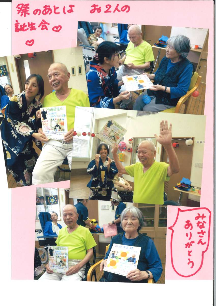 | こんにちは、グループホーム みんなの家 春日部花積です。 納涼祭のあとに8月生まれ お二人の誕生会を 開きました。 おやつはすいかとフルーツポンチです。 和やかに行われた誕生会♪ これからも元気に仲良く過ごせますように。 |