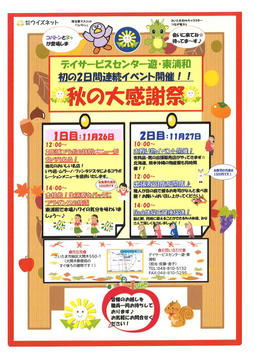 11月26(火)、27日(水)にその名も 「秋の大感謝祭」 11/26(火) 時間:12:00~15:00 11/27(水) 時間:10:00~15:00 場所:すこや家 東浦和 1階 詳しくは下記をご覧ください ぜひお気軽に参加してくださいね!!! |