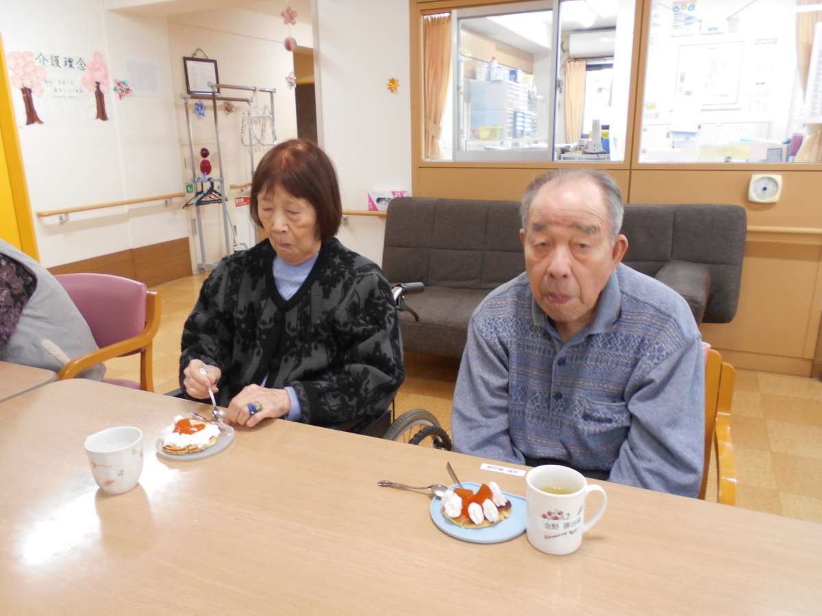 今月は、若いスタッフの手作り・・・パンケーキにゼリーと生クリームをトッピング!!美味しそうなケーキの出来上がり( *´艸`)