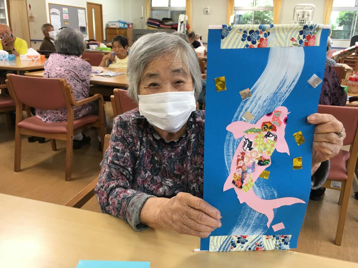 今月の工作は掛け軸風に鯉の滝登りを作りました!鯉の形の画用紙に千代紙でちぎり絵のように貼って頂きました。