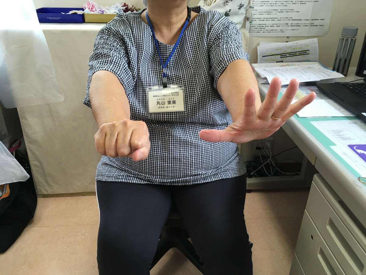 ①両手ともグーパーグーパーを10回行います。握る時、開く時を意識して行いましょう。