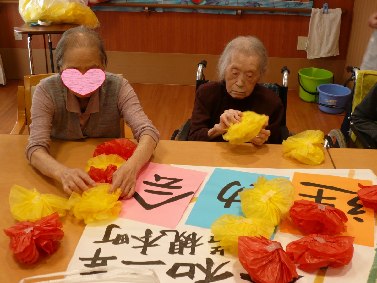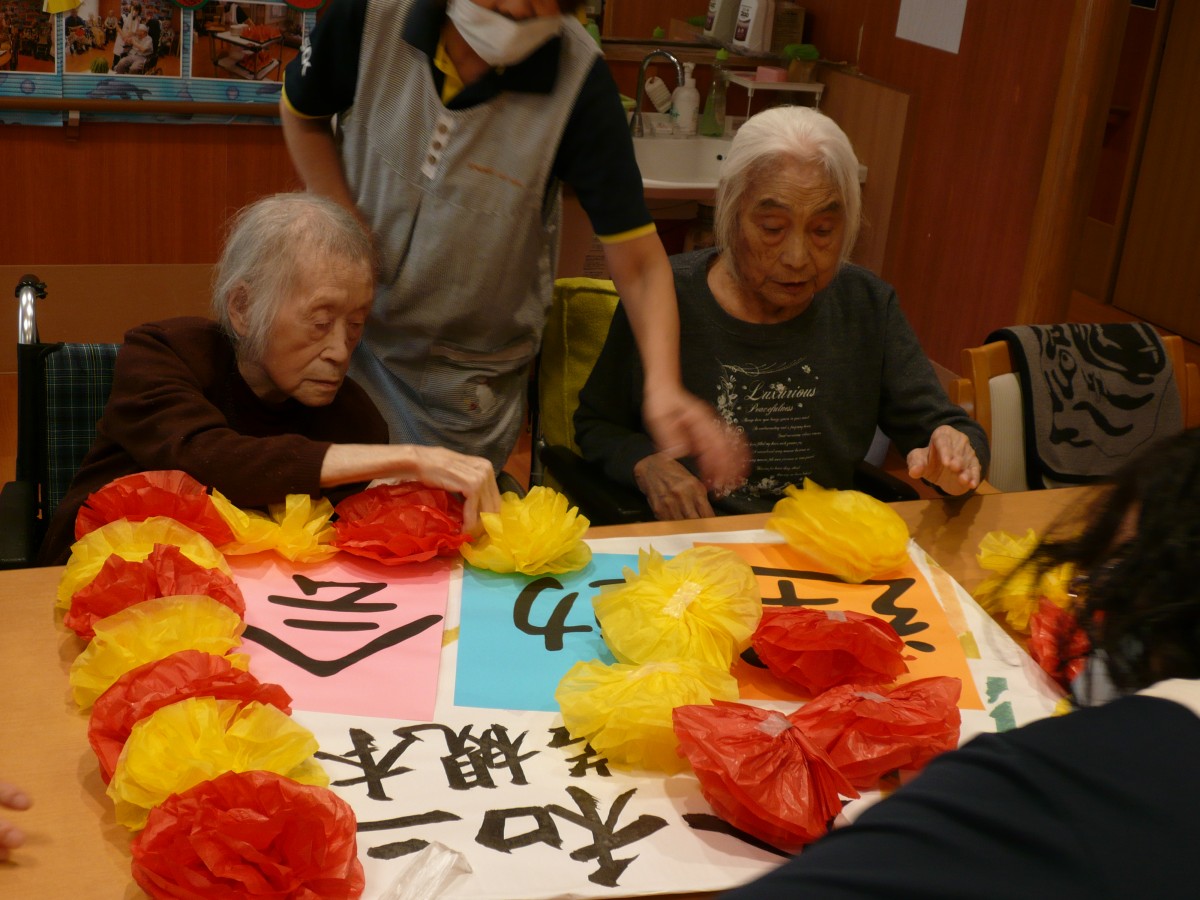 皆様、おはながみを広げて頂き周りに貼っていく作業をして下さりました!