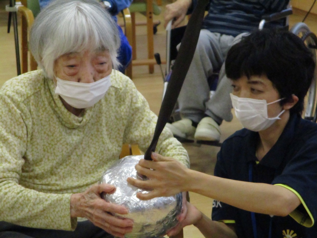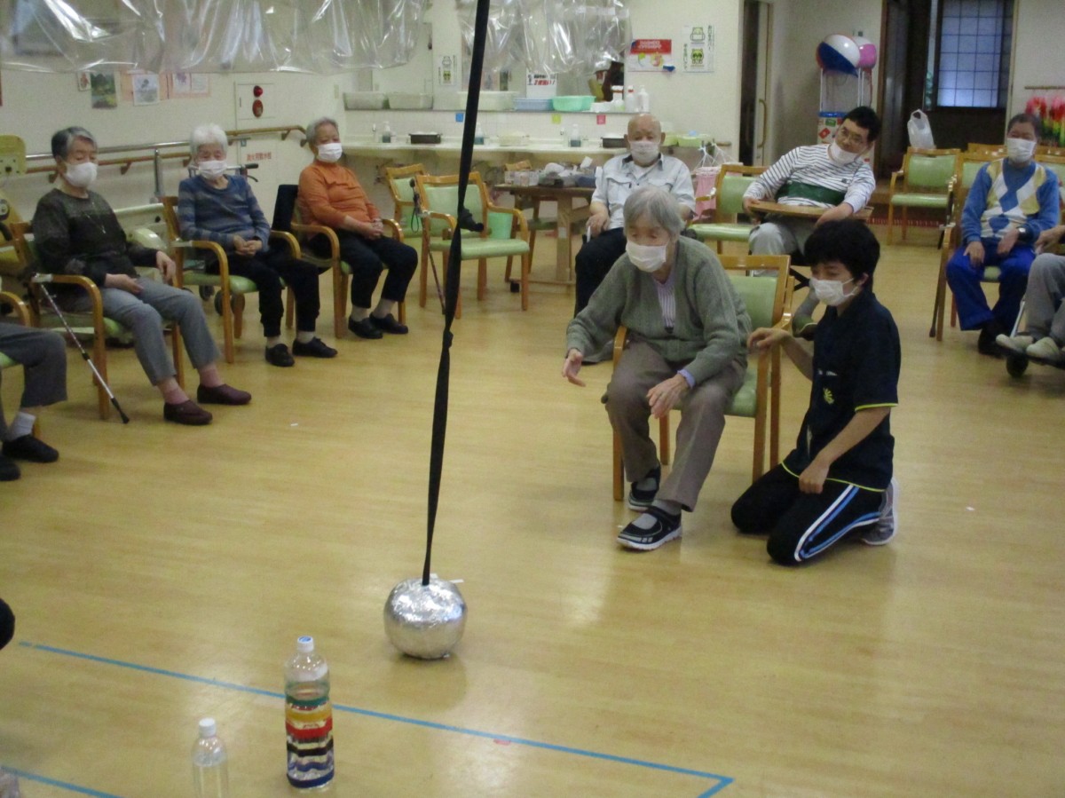 今回の運動レクレーションは『空中ボーリング』です。天井から吊るしたボールを並べてあるピンに向かって投げます!