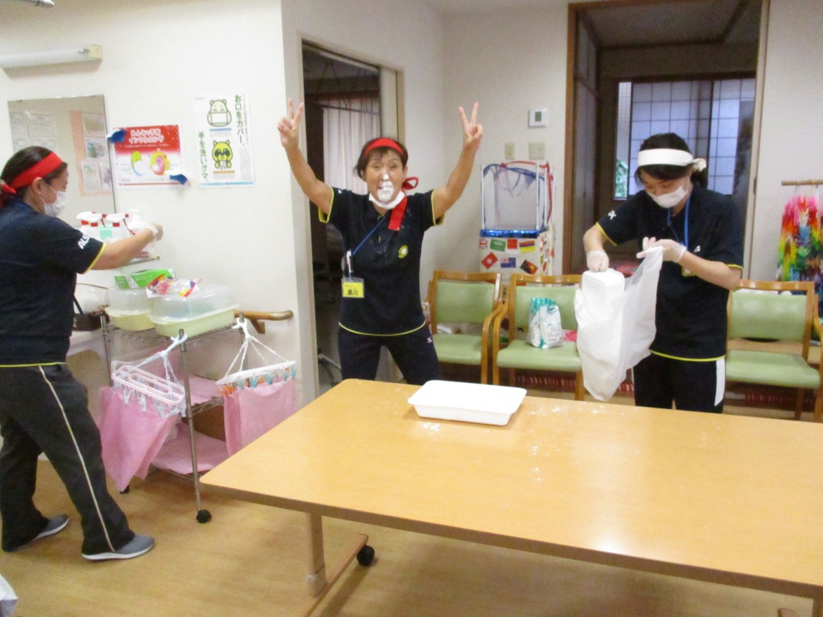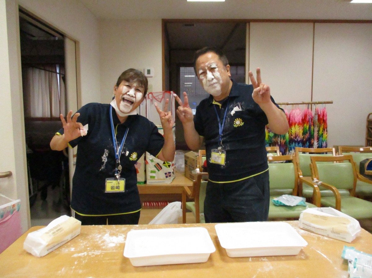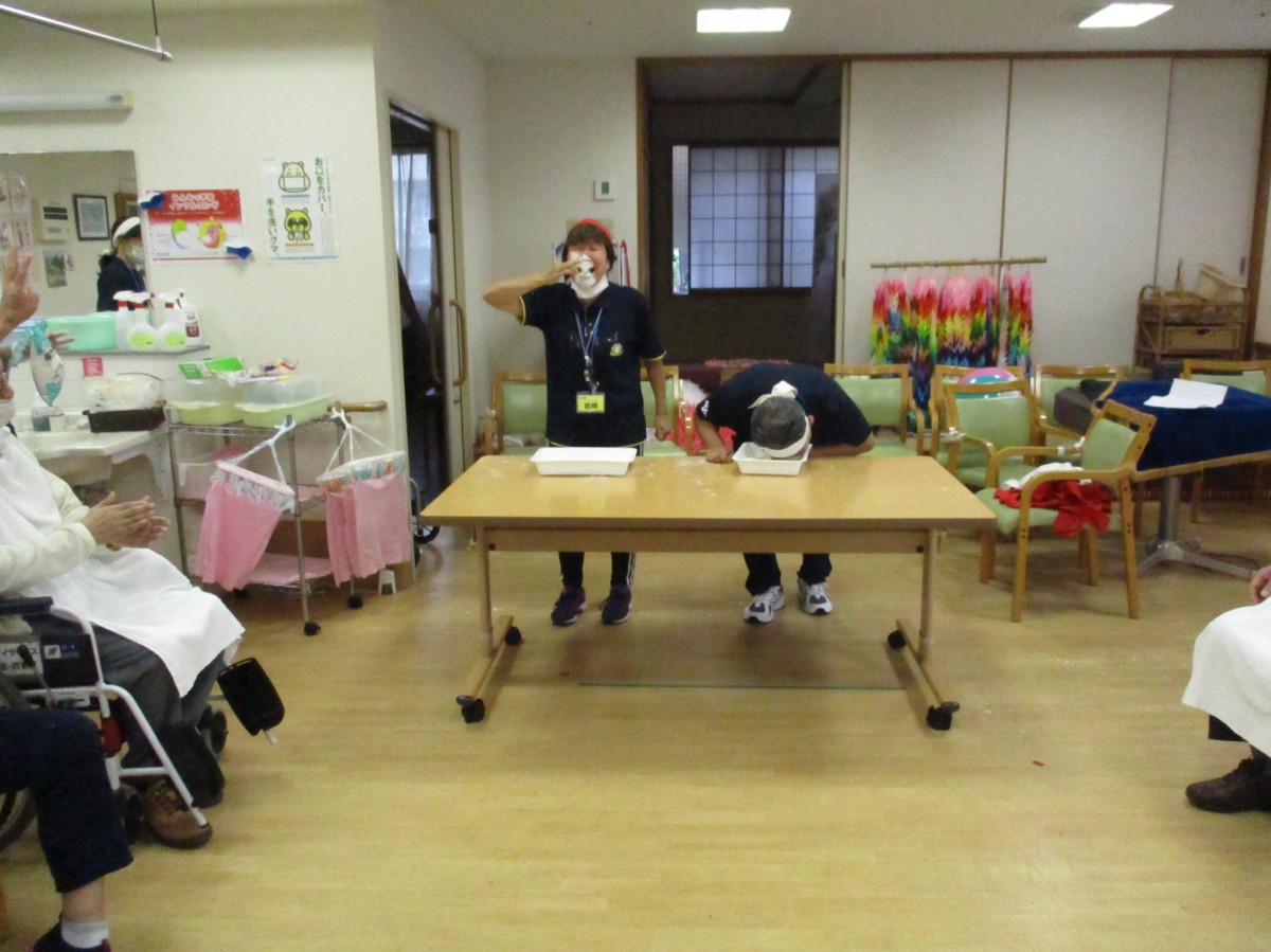 廻りが見えないほど顔に小麦粉を付けた職員が続出しました。それをご覧になったご利用者の方たちは大笑いされていました!!!