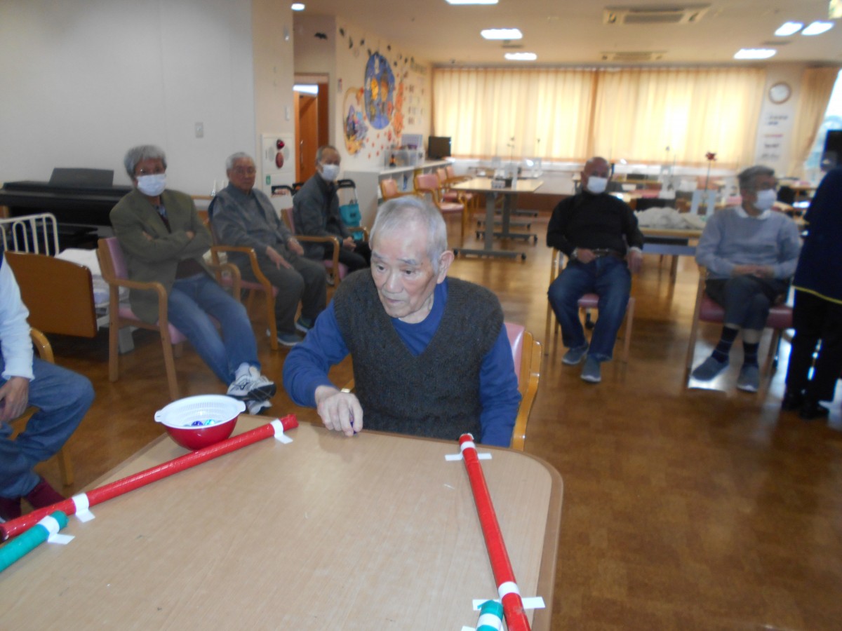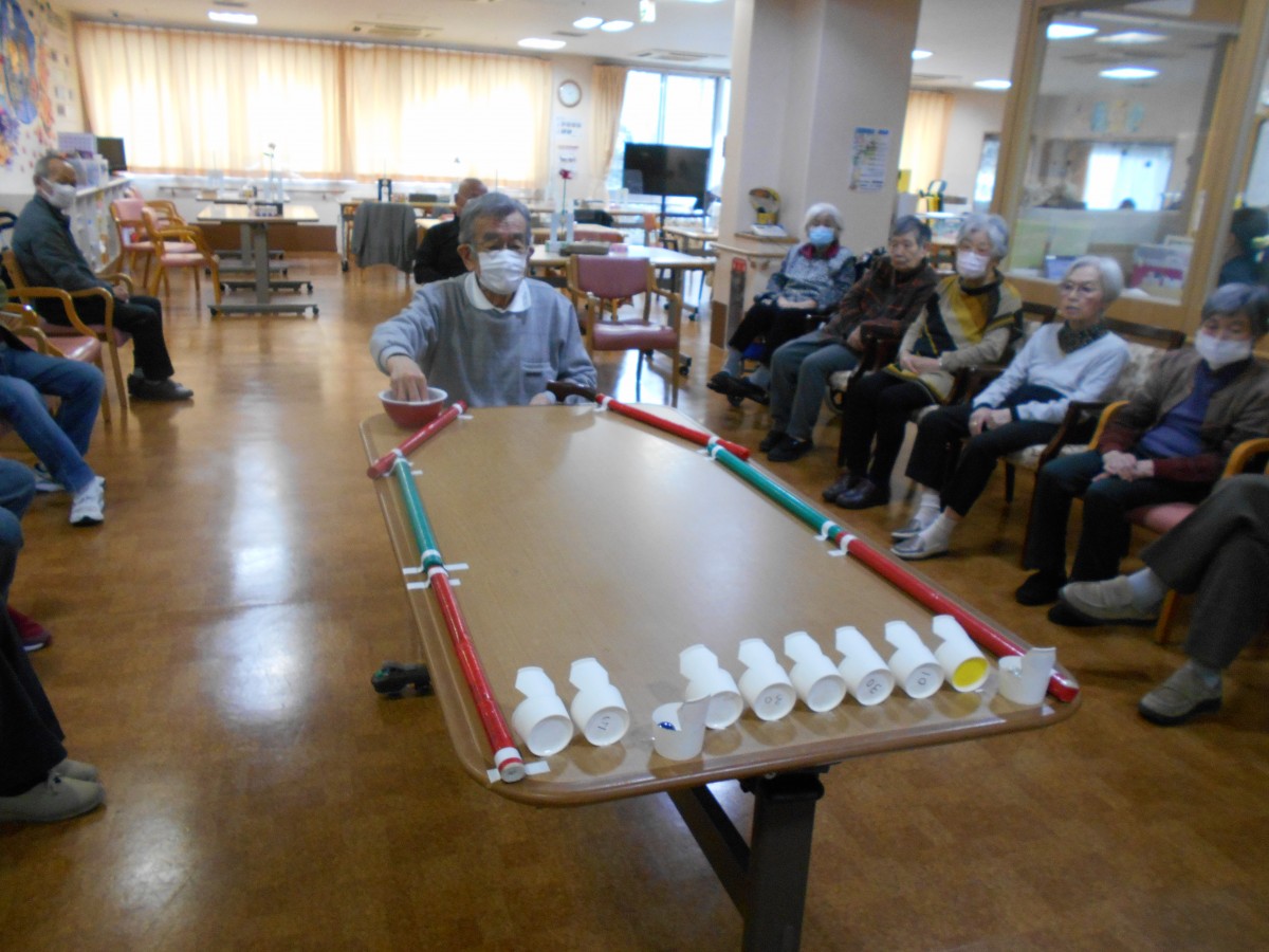 今回のレクリエーションはビー玉を転がして机の先についたカップに入れるというもの。