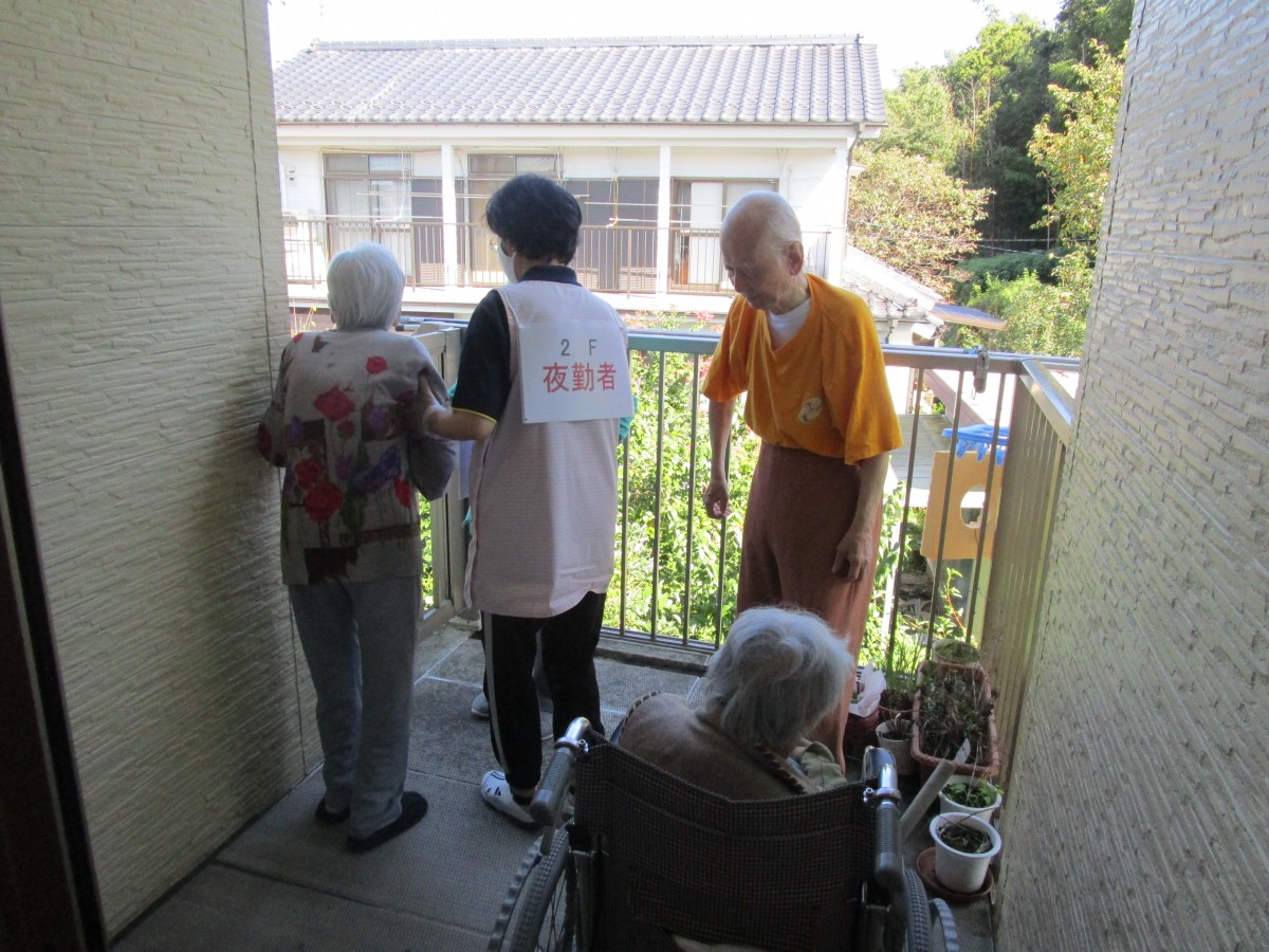 夜間火災を想定した訓練で、入居者様を外に誘導します。