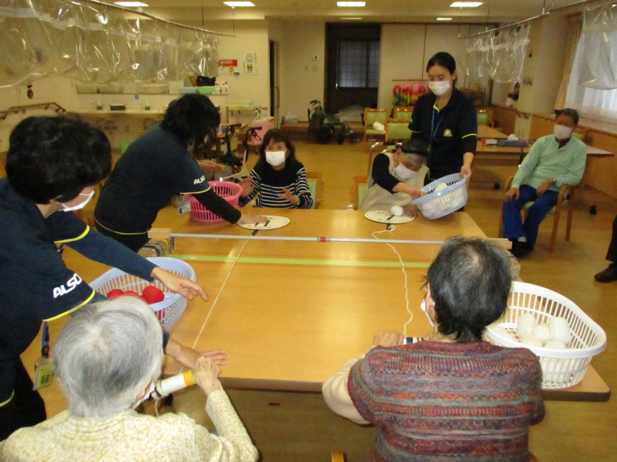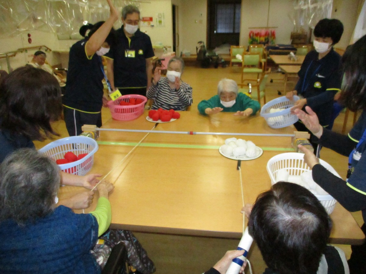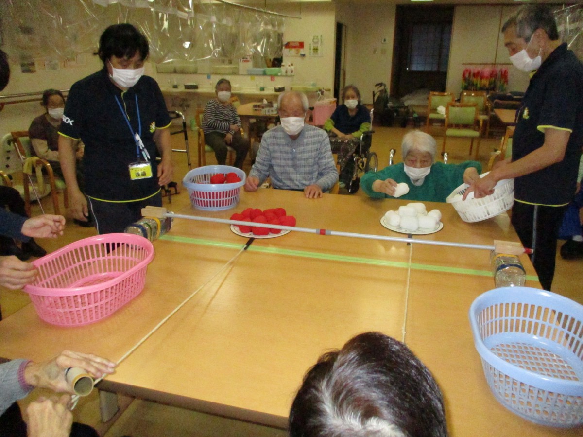 今日の運動レクレーションは『リンボーお手玉』です!そ~れ低く低く!