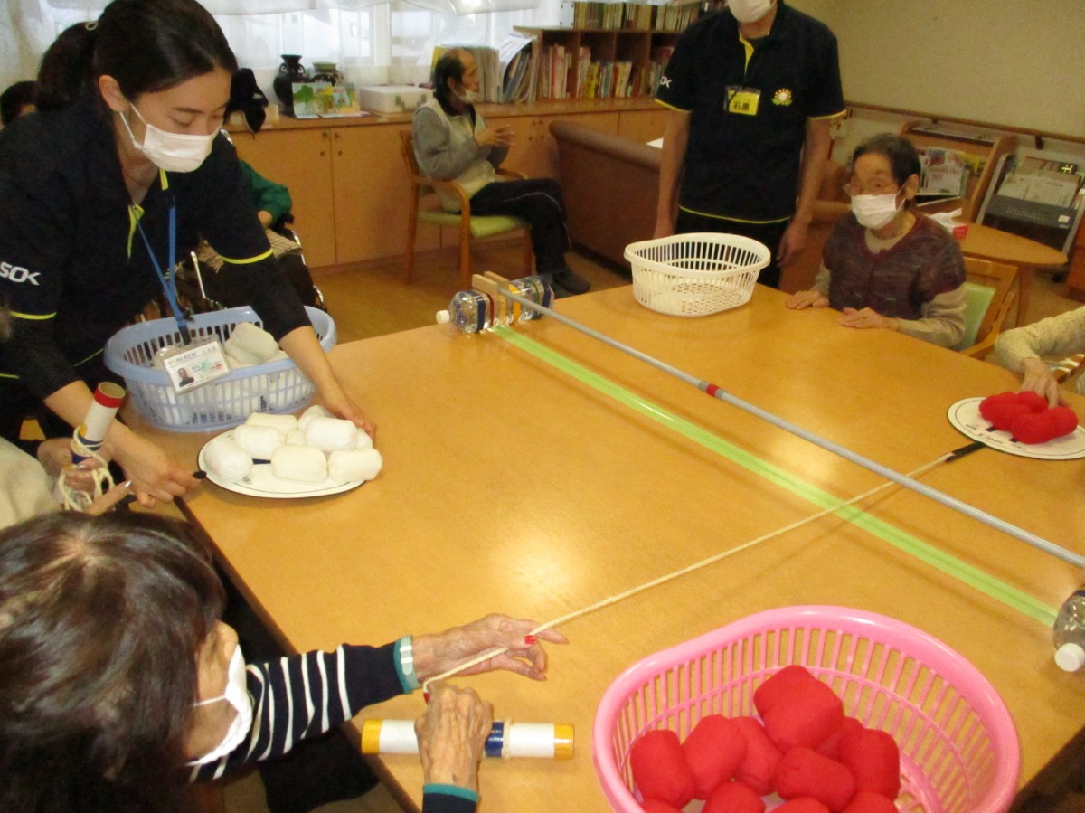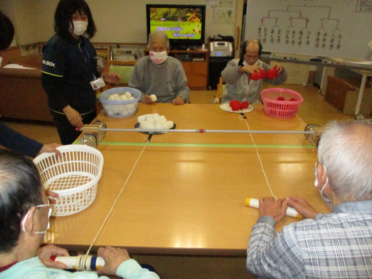 2人一組にて紐のついた団扇の上に1人がお手玉を積んで対面の1人が紐をそーっと手前に引き落ちない様に自分の前に引っ張れたらok!