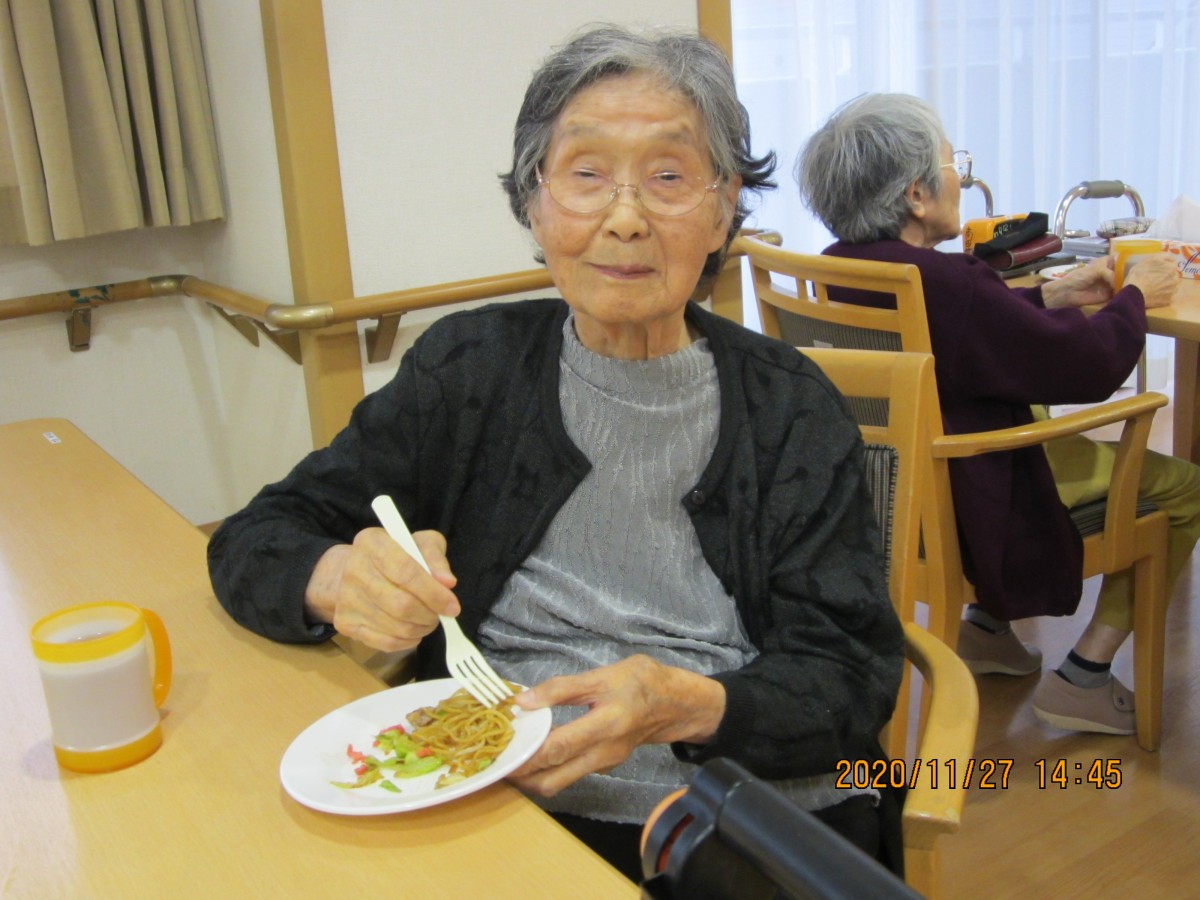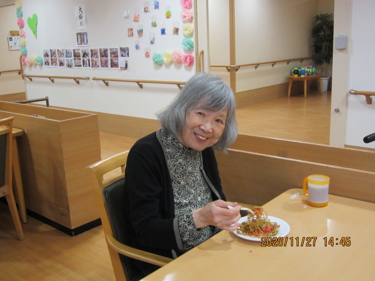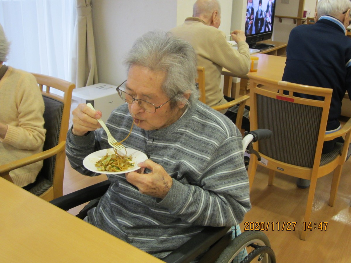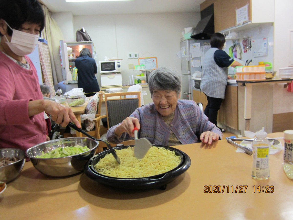 入居者様の皆さん、スタッフ、一緒になって、それはそれはおいしい焼きそばの出来上がりです!! 皆さん一緒になって作った焼きそばの味は格別ですね。