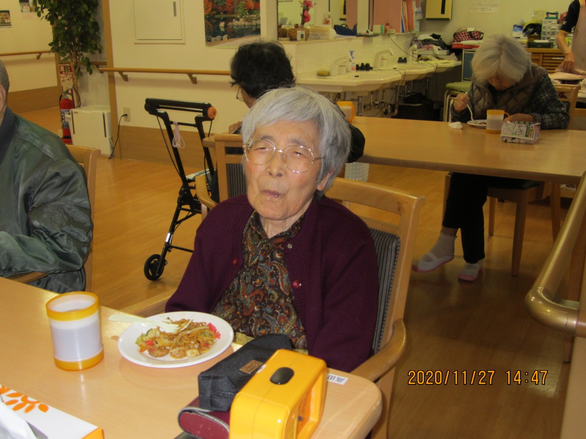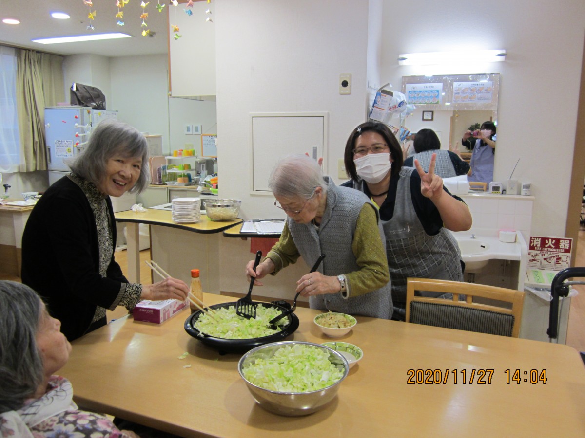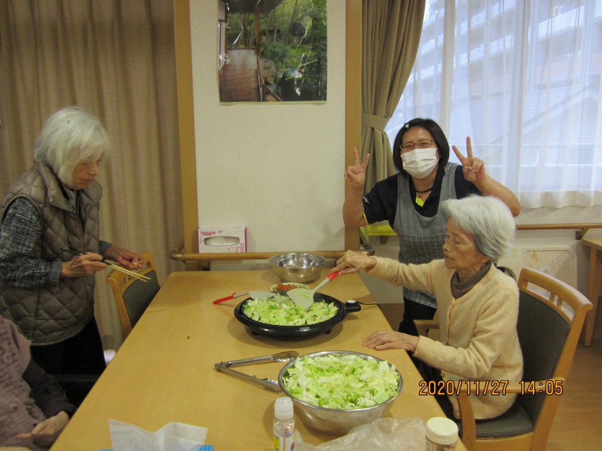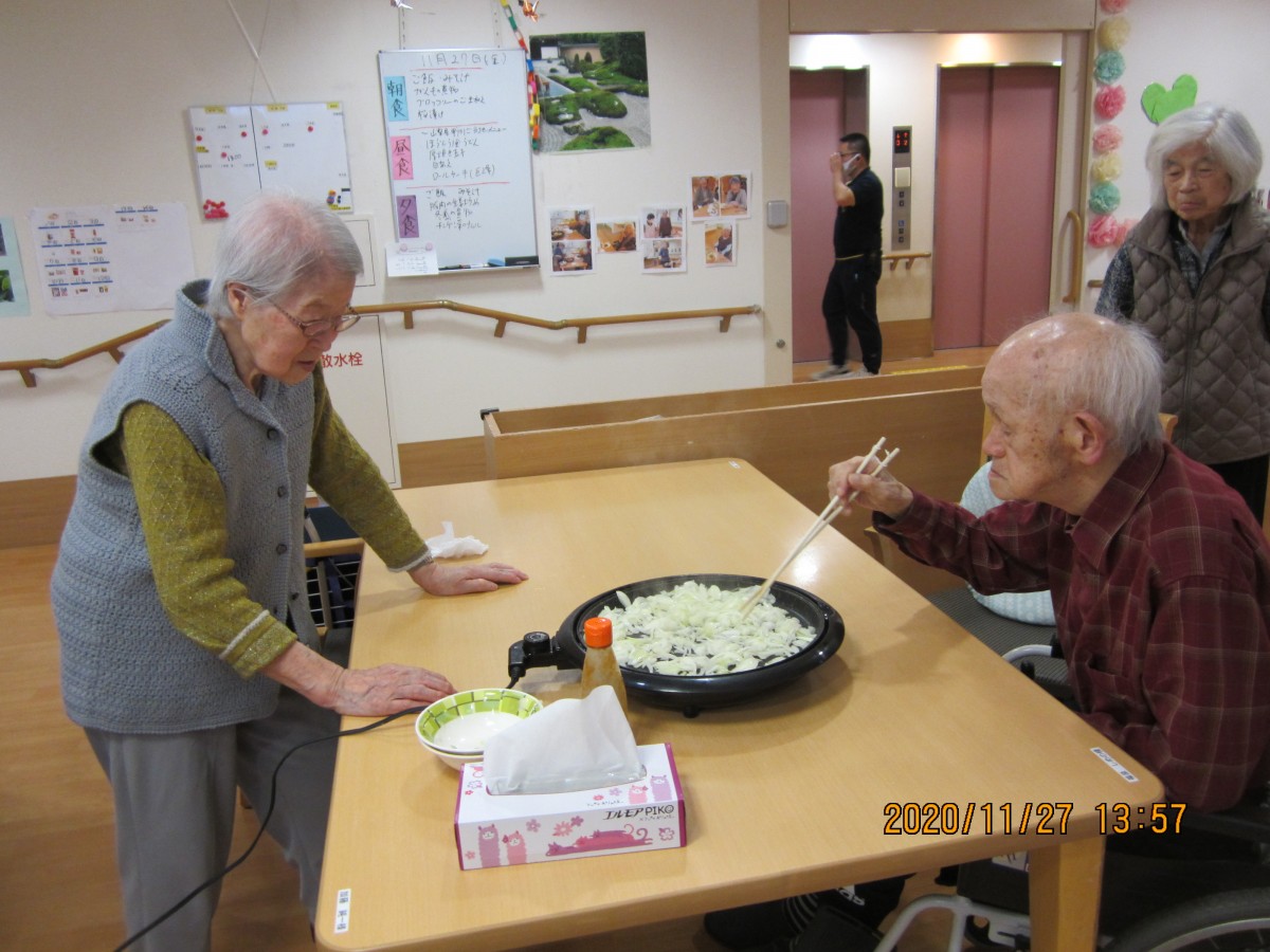 入居者様の皆さん、スタッフ、一緒になって、それはそれはおいしい焼きそばの出来上がりです!! 皆さん一緒になって作った焼きそばの味は格別ですね。