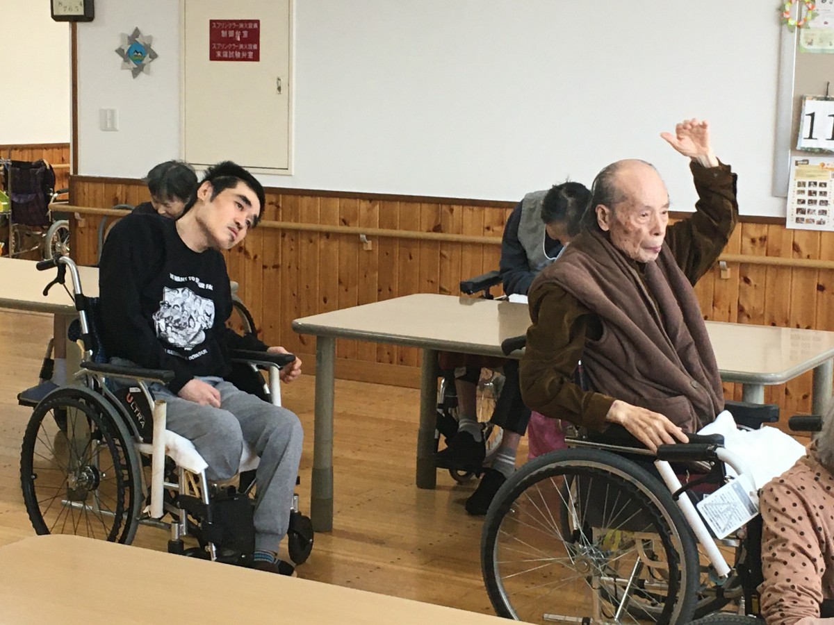 昼食前の時間、ご利用者様にお集まり頂いて、体操を行いました。