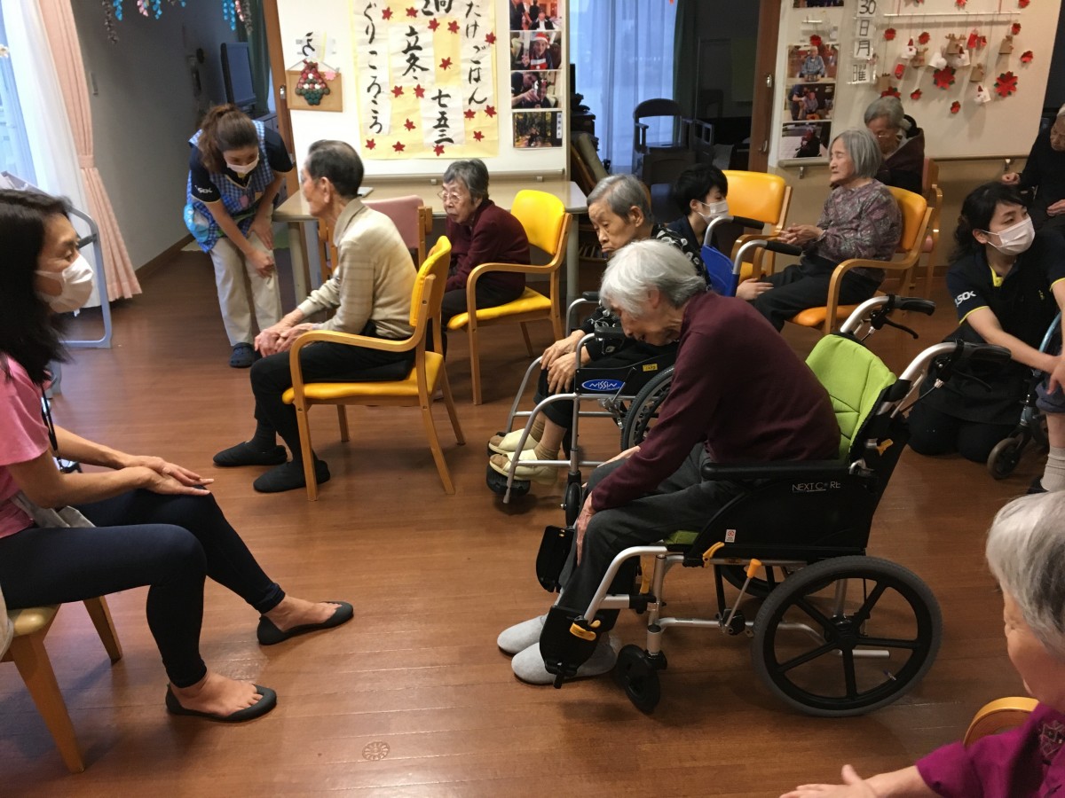 いるのですが、本日はその職員達を指導してくださったインストラクターさんをお招きしてご利用者様の皆様と夕食のお食事前の時間にほんのりとヨガレッスンをしていただきました(*'▽')