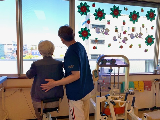利用者様と機能訓練スタッフ 訓練実施中、外の景色をみながら仲良く談笑♪