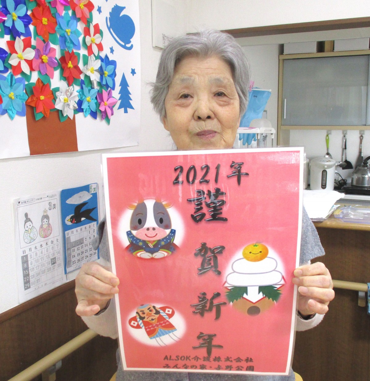 謹賀新年のポスターを貼り、鏡餅も飾りました。