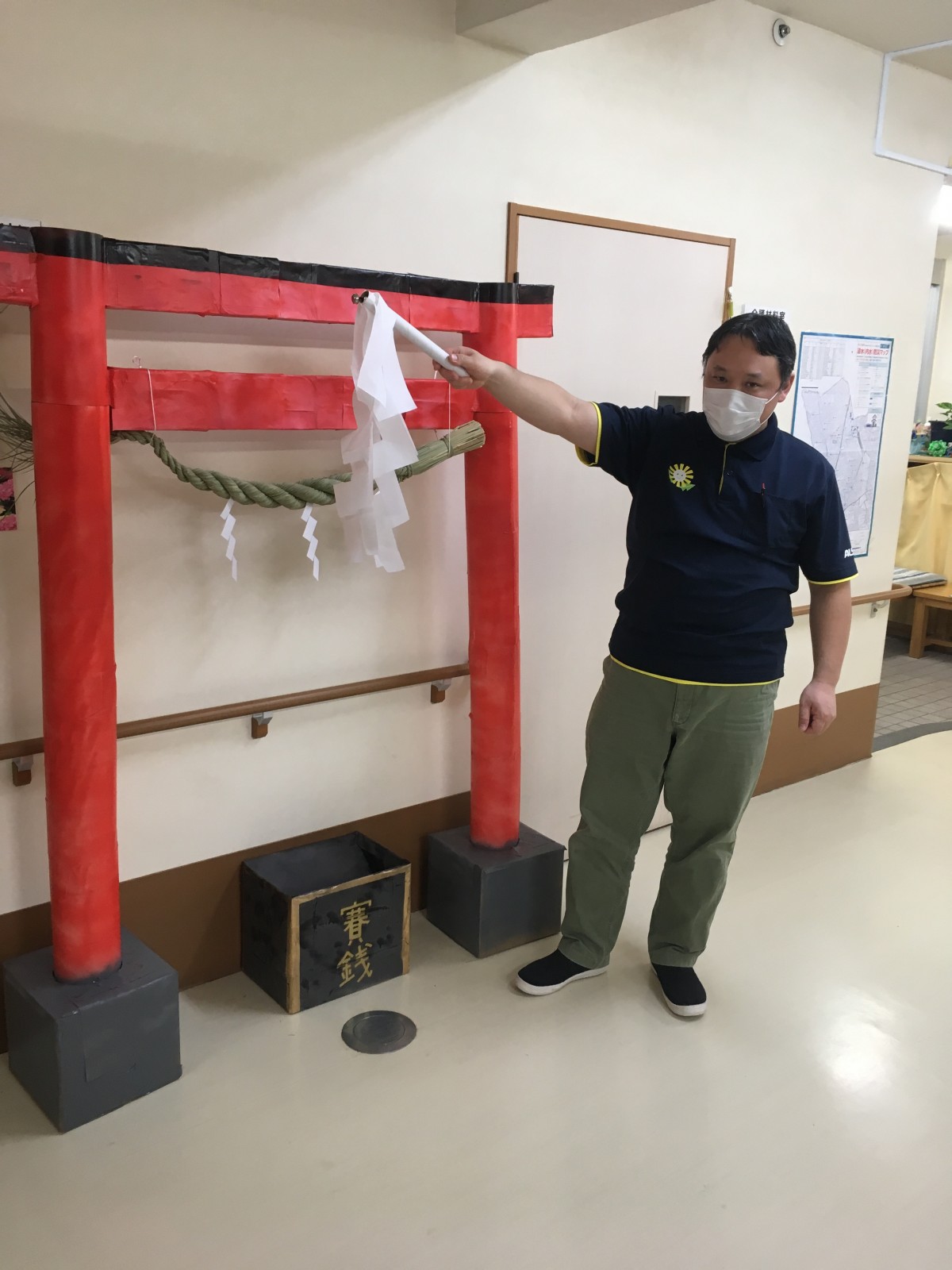 ショートステイみんなの家・大宮吉野町では、2021年元日に向けて「施設で初詣」を実施すべく、鳥居・賽銭箱・玉串を作成。ようやく完成し元日を待つだけとなりました。今年は開始早々新型コロナウイルス感染の影響により、外に出てのレクリエーションやちょっとした外出についても自粛せざるを得ない状況となり、外出以外でのイベントを考案・実施する事が多々ありました。そして来年以降も影響が続く様子で、初詣に行く事さえままならないという事となり、前回写真(製作途中)を掲載させて頂きましたが、鳥居作成から始まり完成に至りました。