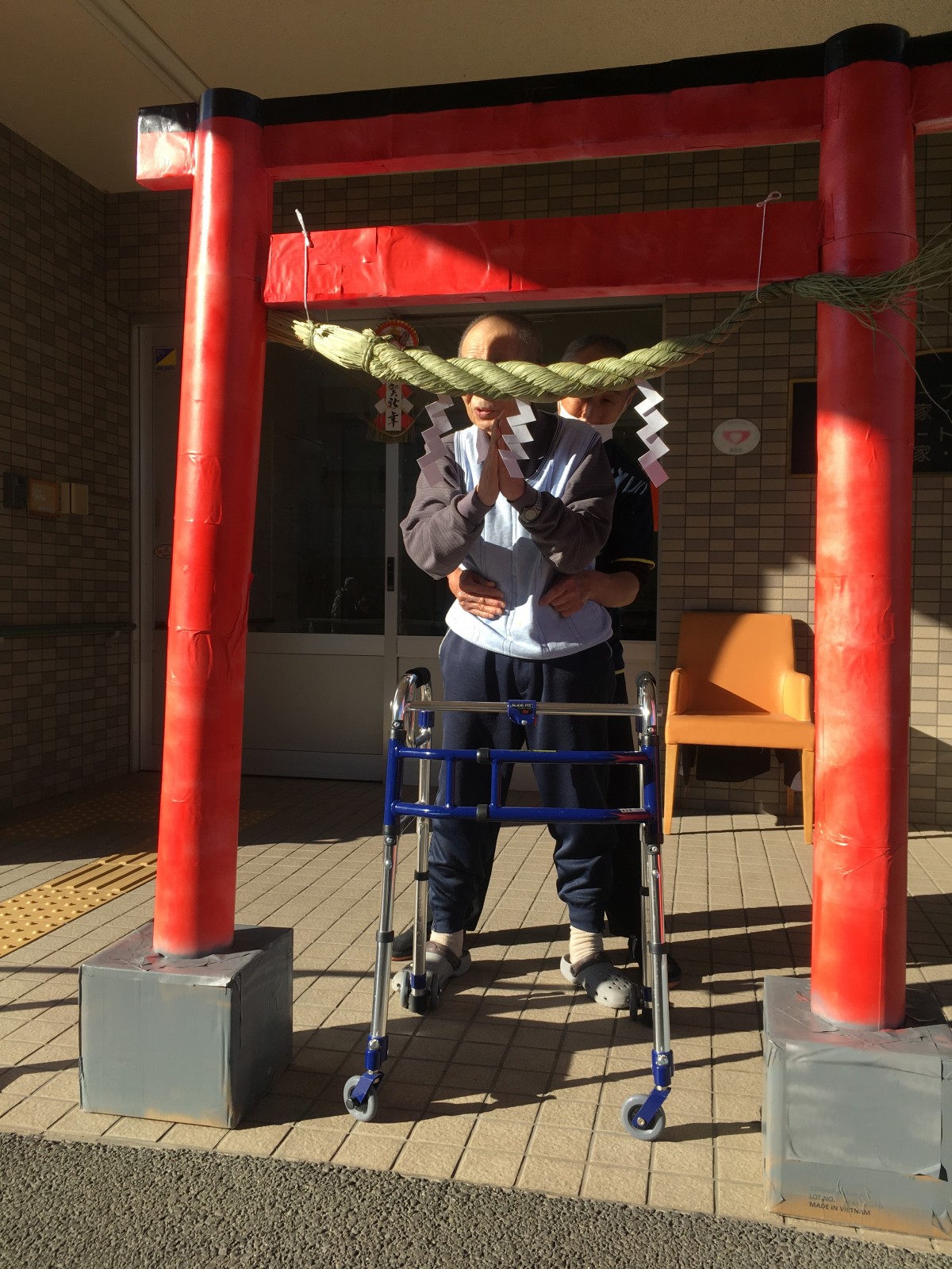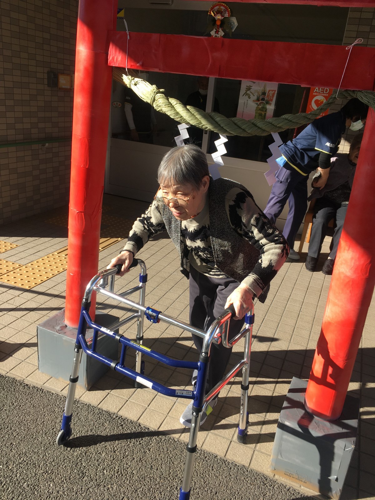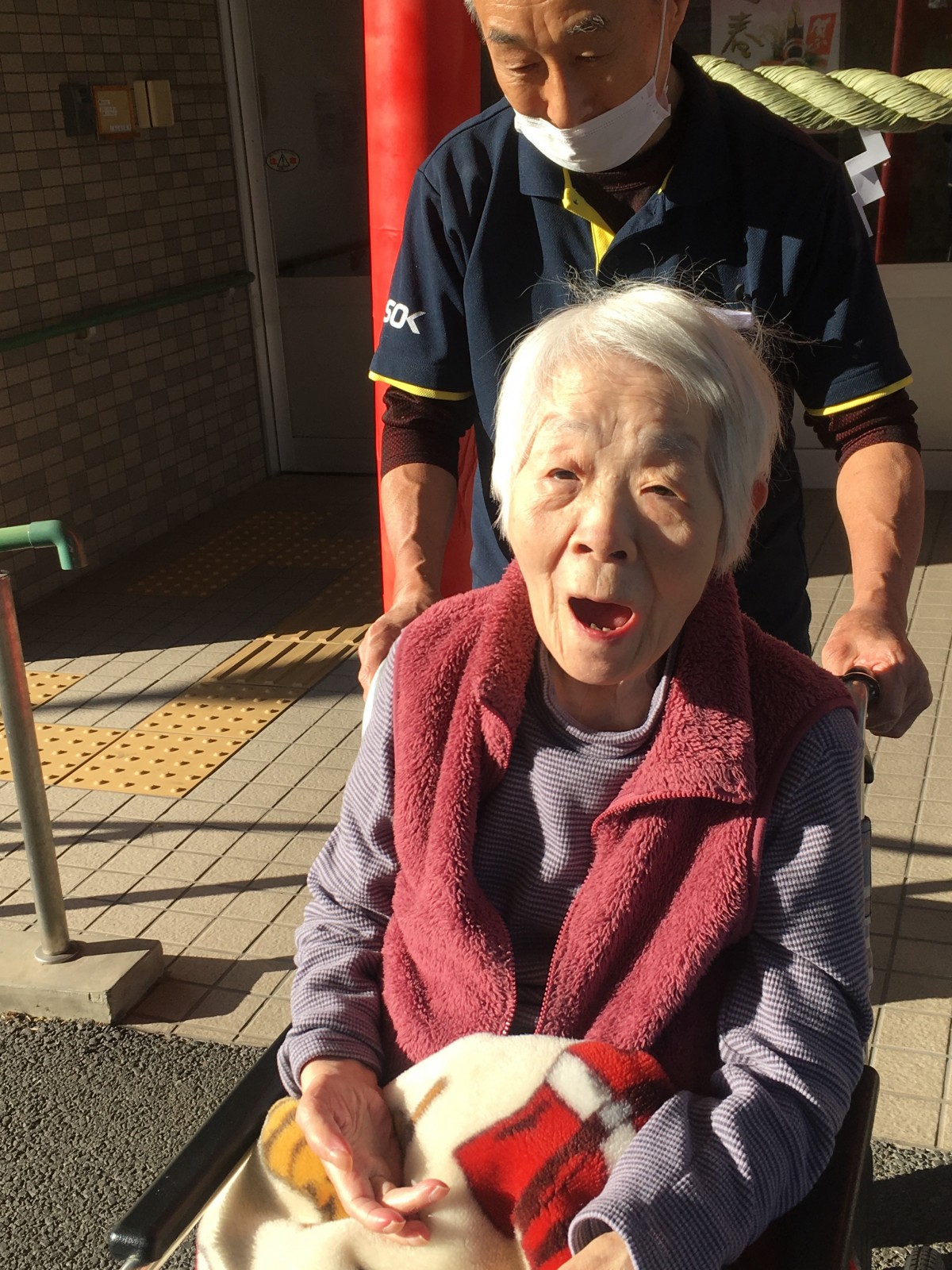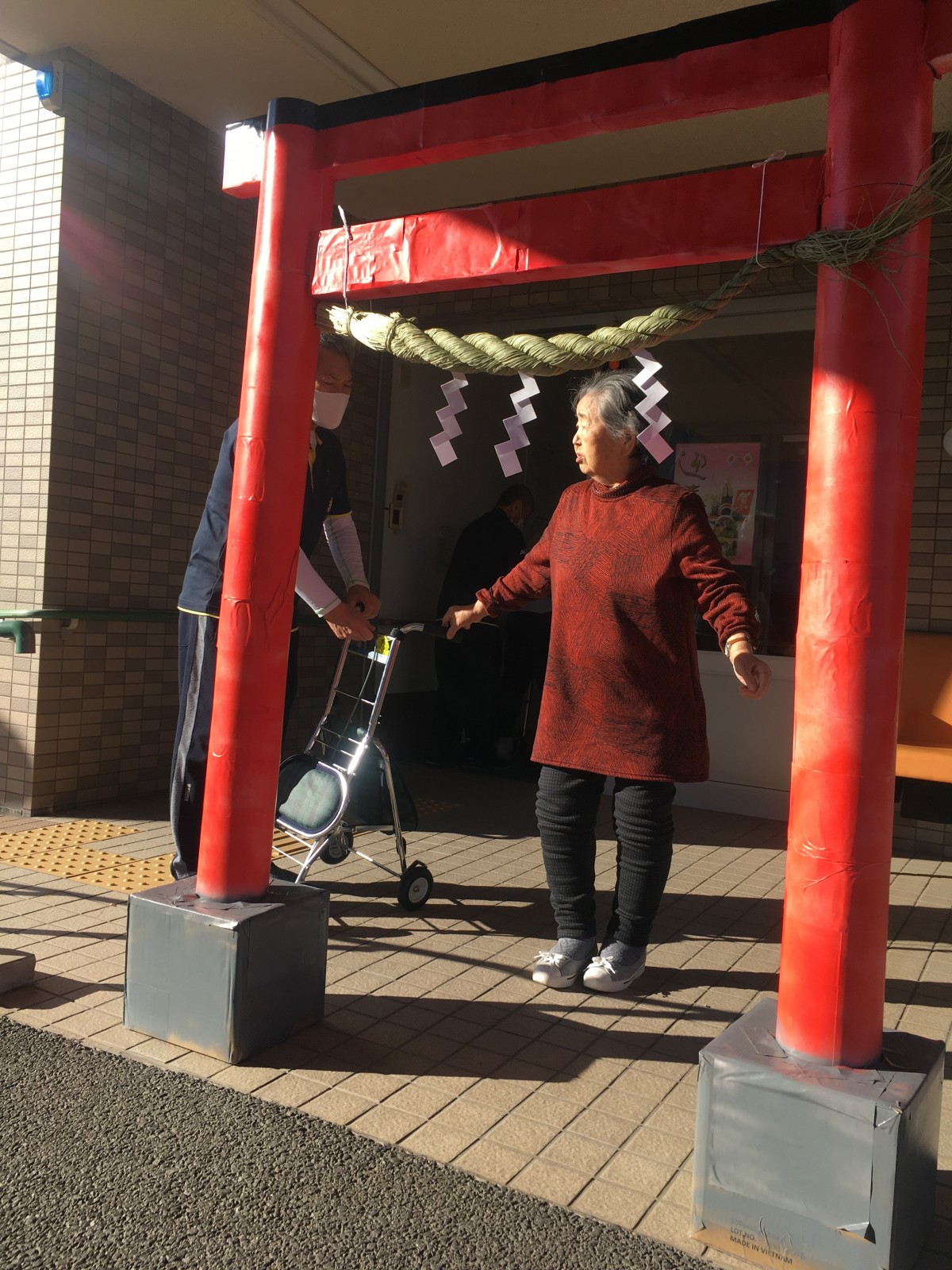 幸い天候にも恵まれ温かい新春の日差しの中、御利用者様に「ショートステイみんなの家・大宮吉野町」神社に初詣の参拝。大変喜んで頂き、参拝後は温かい甘酒を召し上がって頂きました。