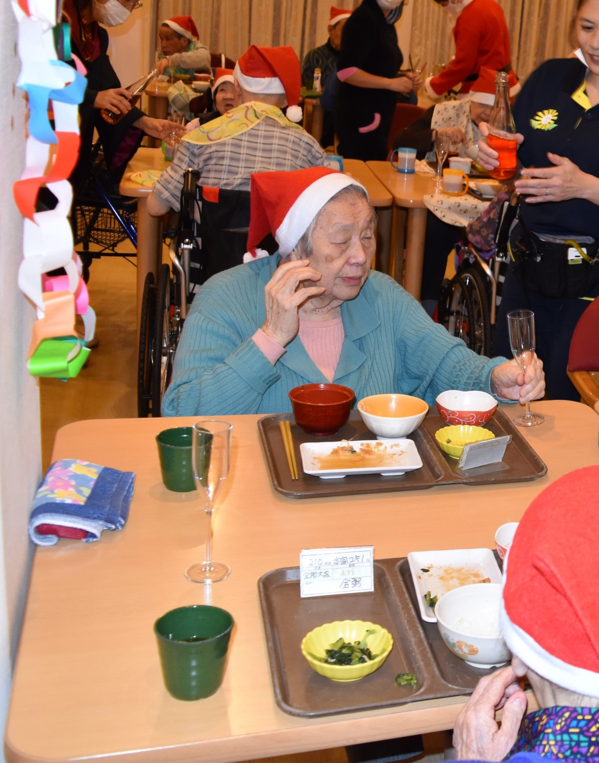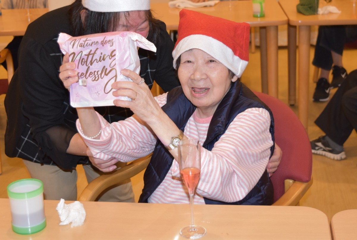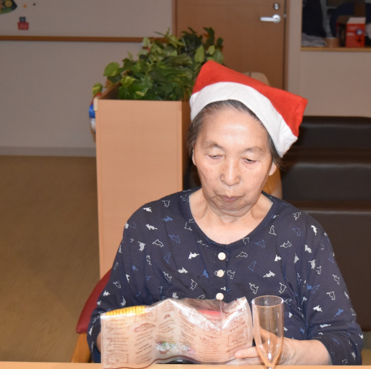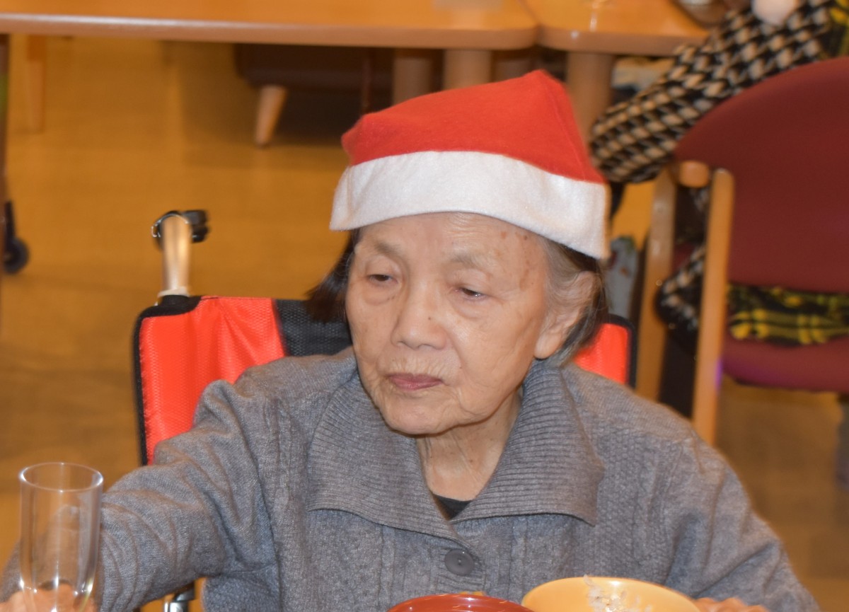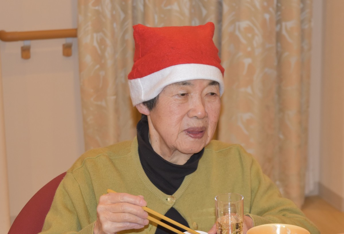 最終日の今夜はご入居者様にもサンタのキャップを被って頂きました。