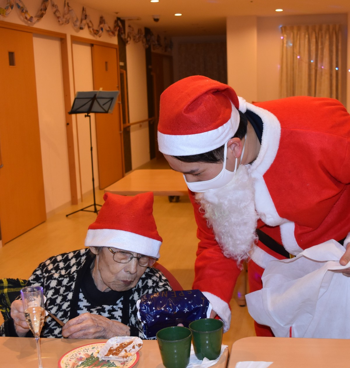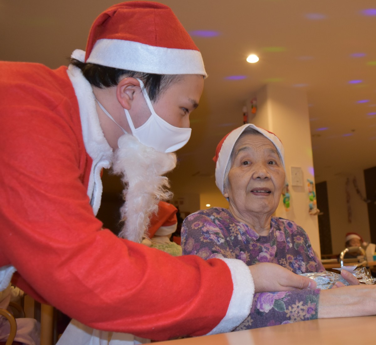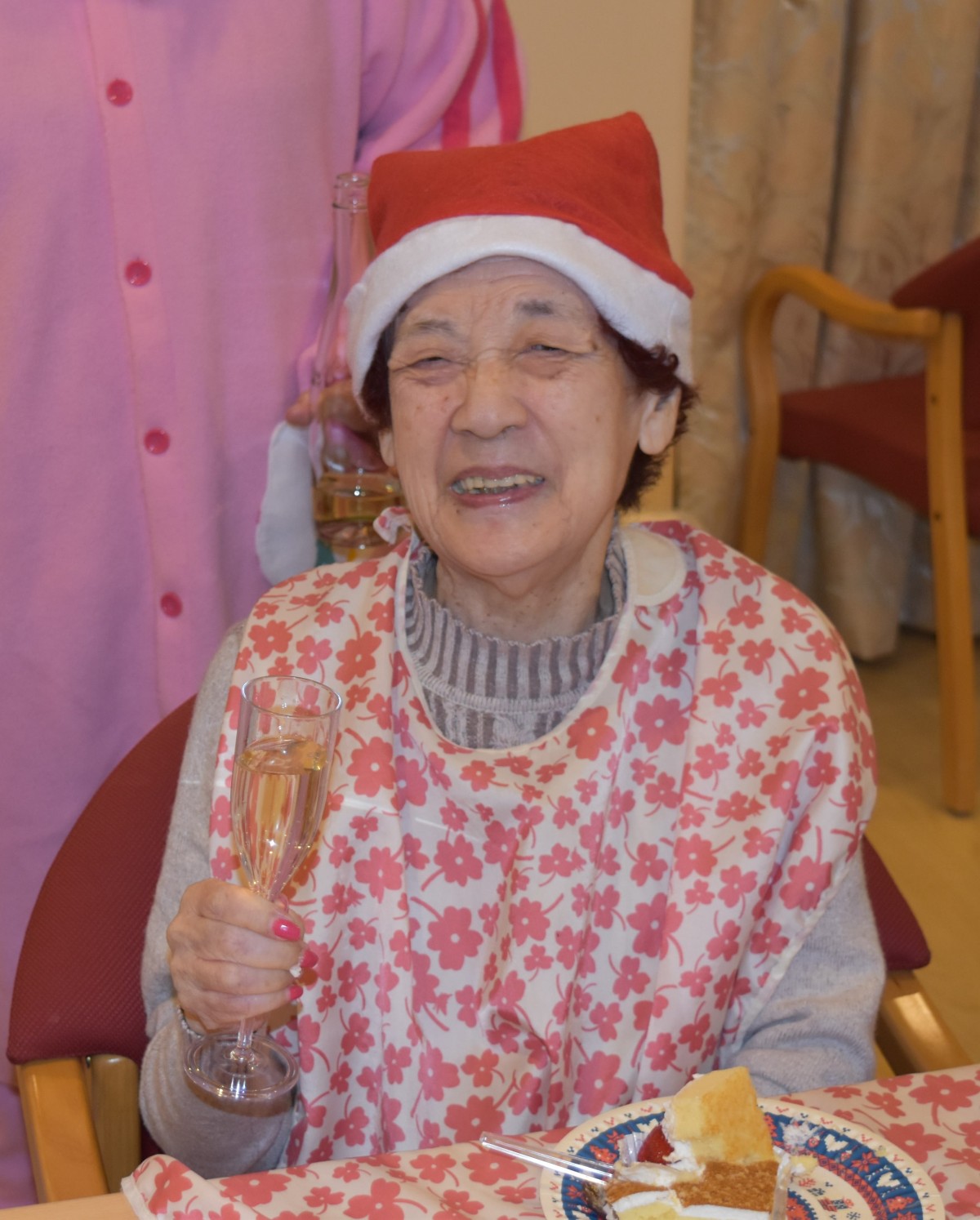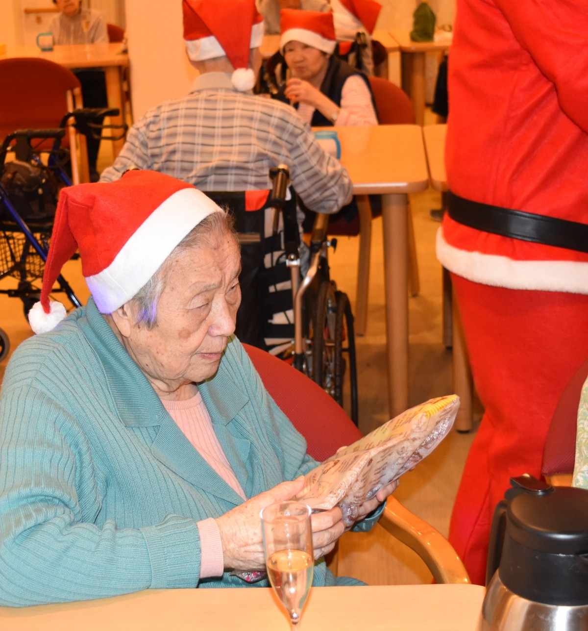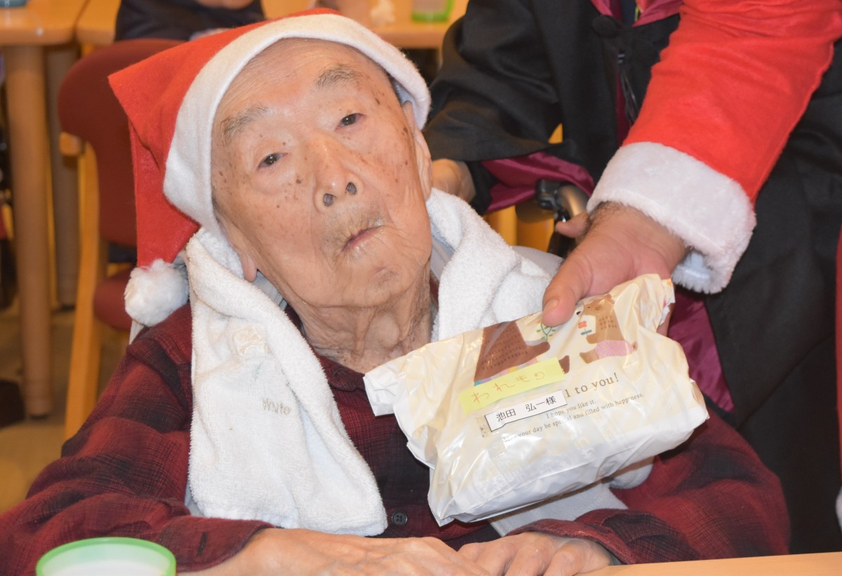 最終日の今夜はご入居者様にもサンタのキャップを被って頂きました。