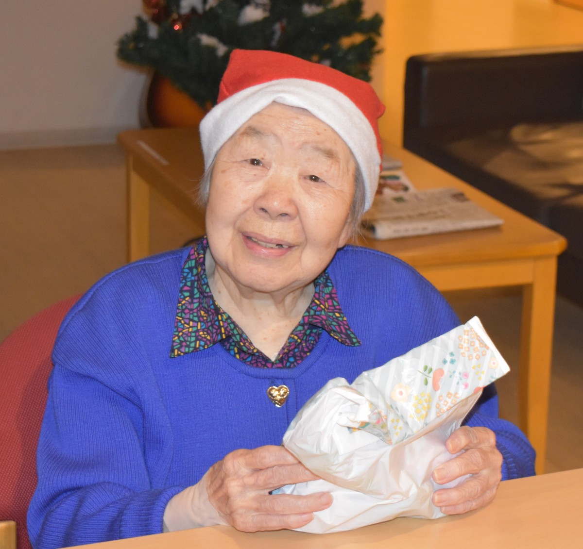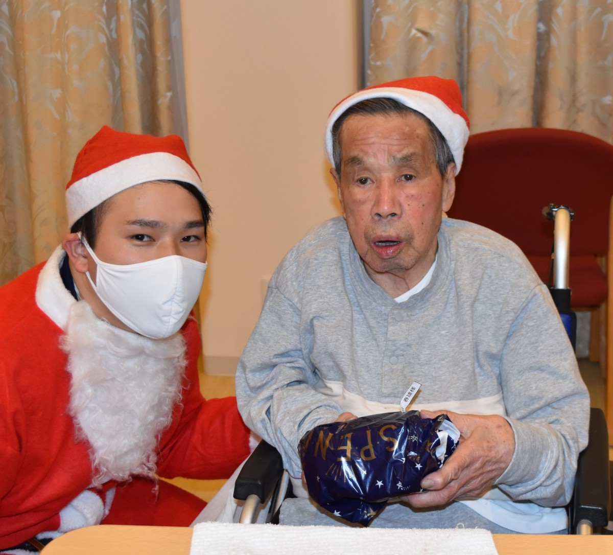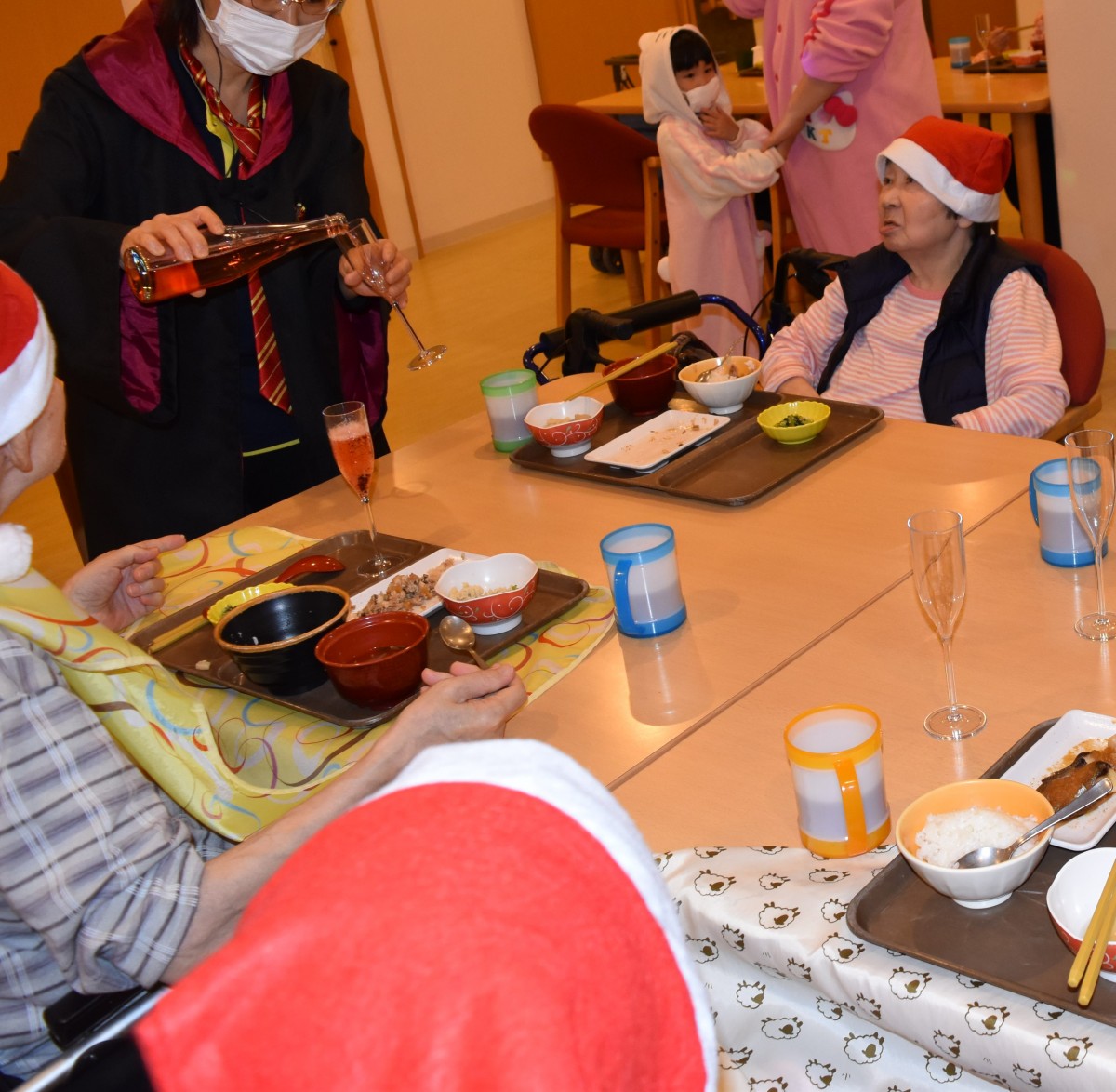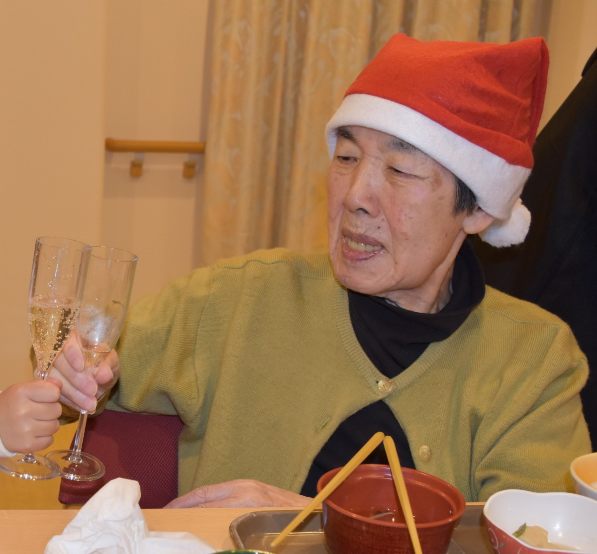 最終日の今夜はご入居者様にもサンタのキャップを被って頂きました。