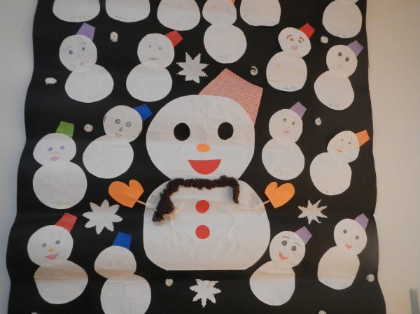 「雪だるま」の貼り絵は、ご利用者様にお手伝いいただき完成。