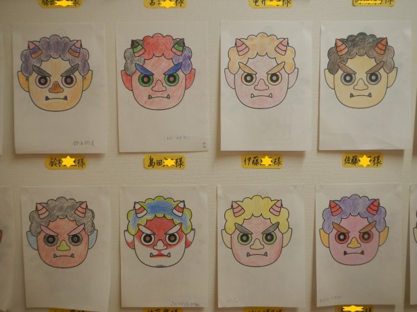 塗り絵は、個性溢れる配色で、いろいろな「鬼」や「スケート」が塗りあがりました。