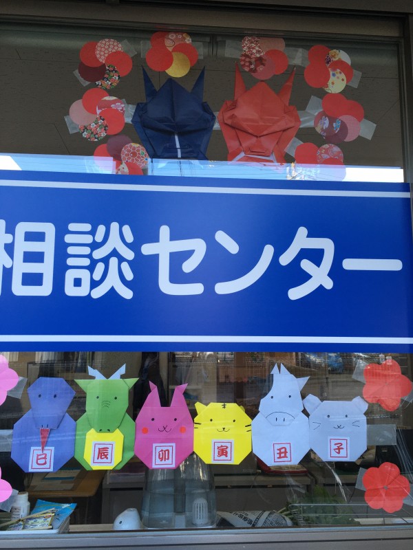 鬼とおたふくも窓に飾っていますよ。せせらぎの近くにきた方は窓にも注目してみてくださいね。