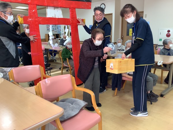 1月4・5日に初詣を行ないました! まずは鳥居をくぐり、お賽銭をします お金はデイサービスの手作りお札を使っています( ・∇・