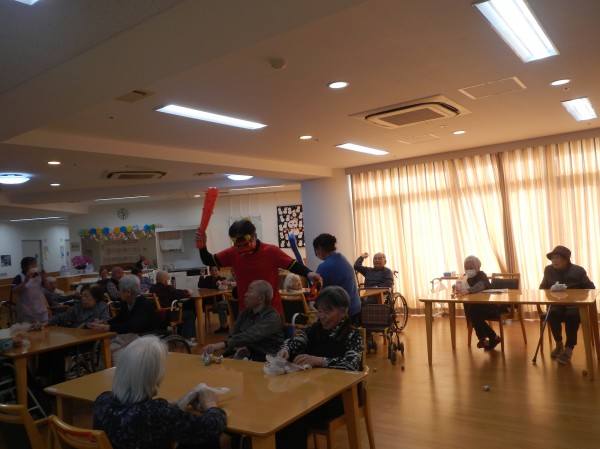 少々びっくりするご利用者様もいましたが、登場するや否や新聞紙で作った豆を鬼目掛けて集中砲火!!